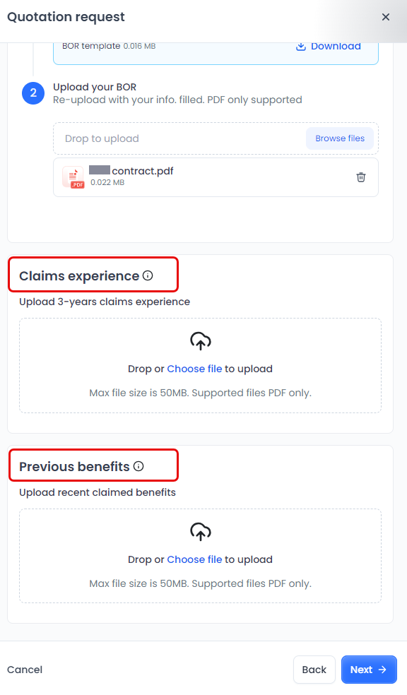 When companies have prior insurance claims, users will follow the same steps to submit a request. However, a new section, 'Claims Experience' will be added in the insurance history step, allowing users to provide their claims history and upload a document detailing previous benefits.