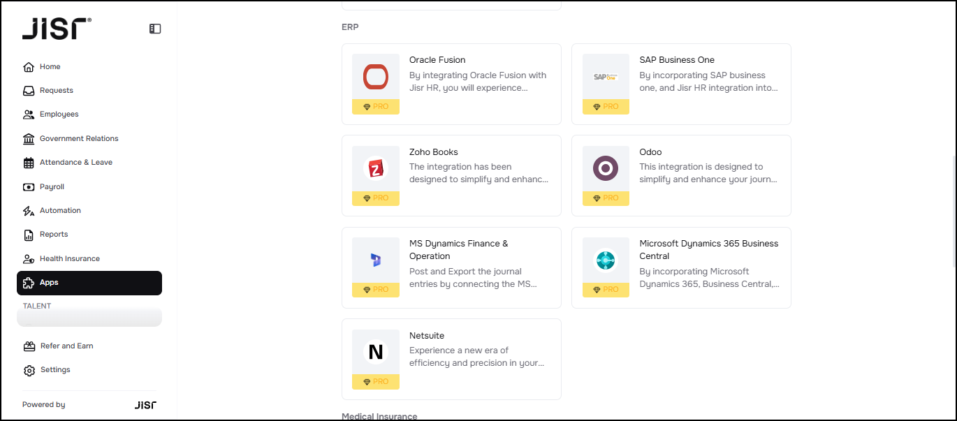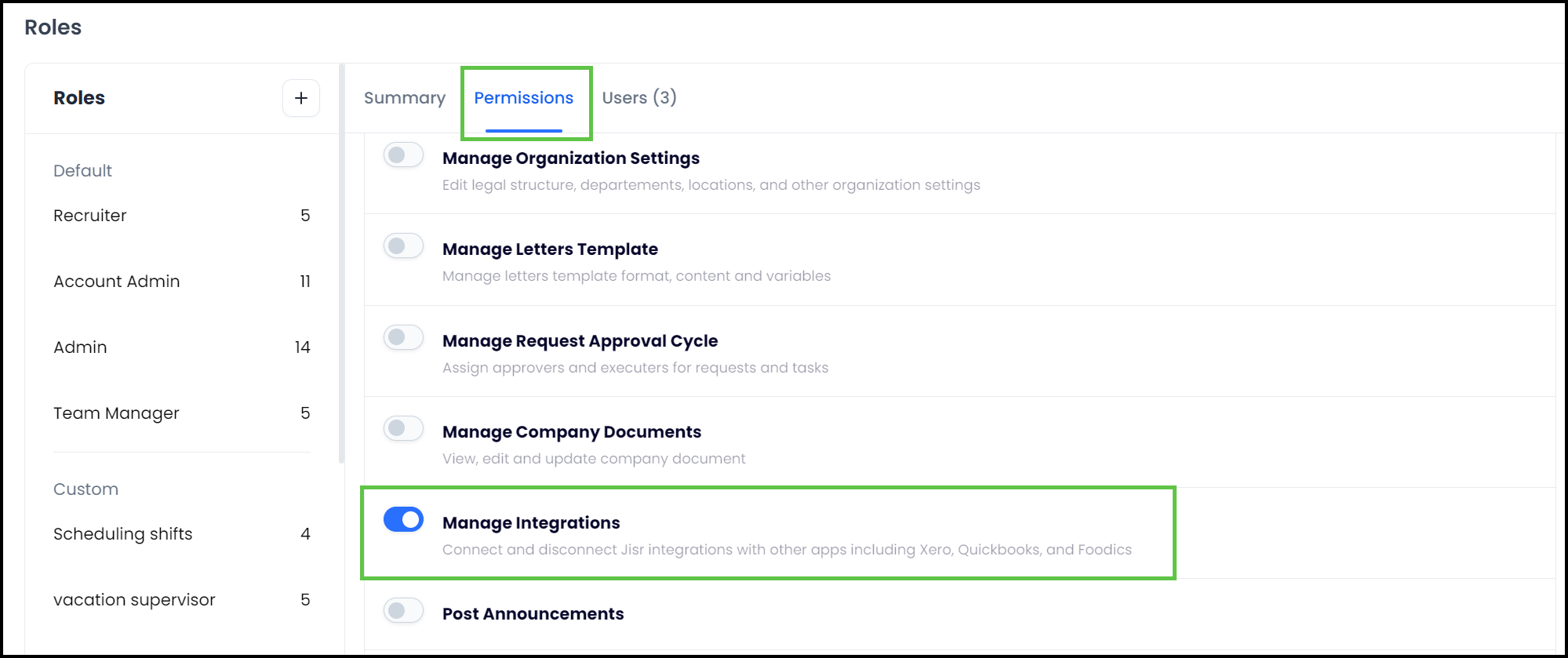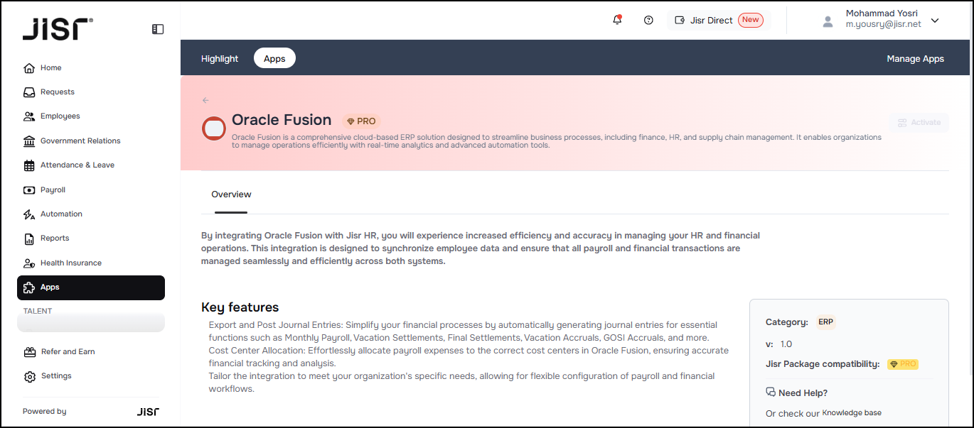 Note: Permissions Required to activate Oracle Fusion Integration with Jisr "admin" role or custom role with "manage integratons" permission.