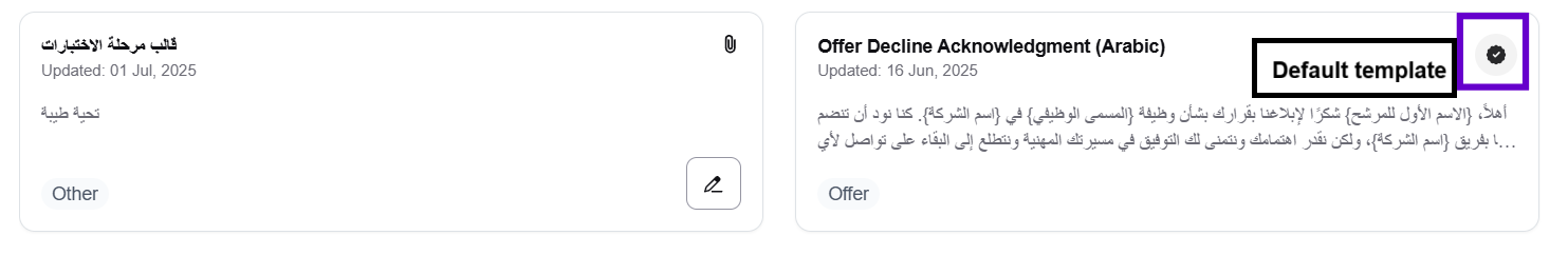 - There are default templates provided by Jisr that cover the most common topics in candidate communications, organized into specific categories; application stage, feedback & surveys, interview stage, and offers.