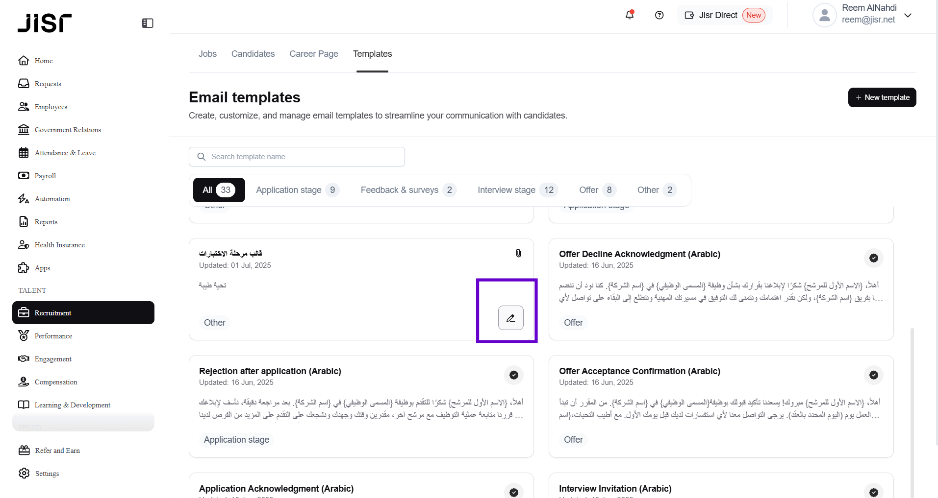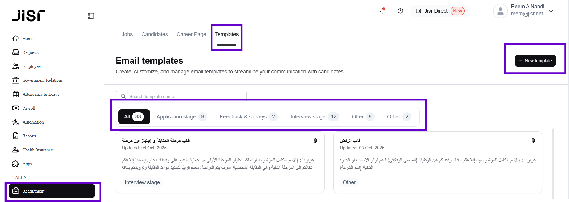 On the 'Email Templates' page, you’ll see the available templates (provided by Jisr) organized by subject.