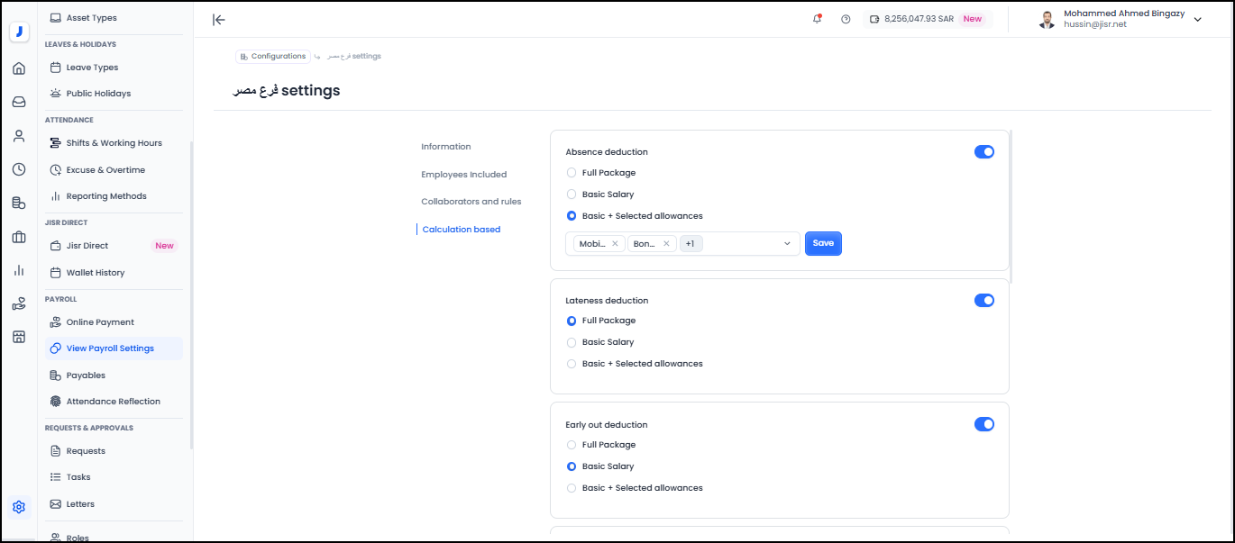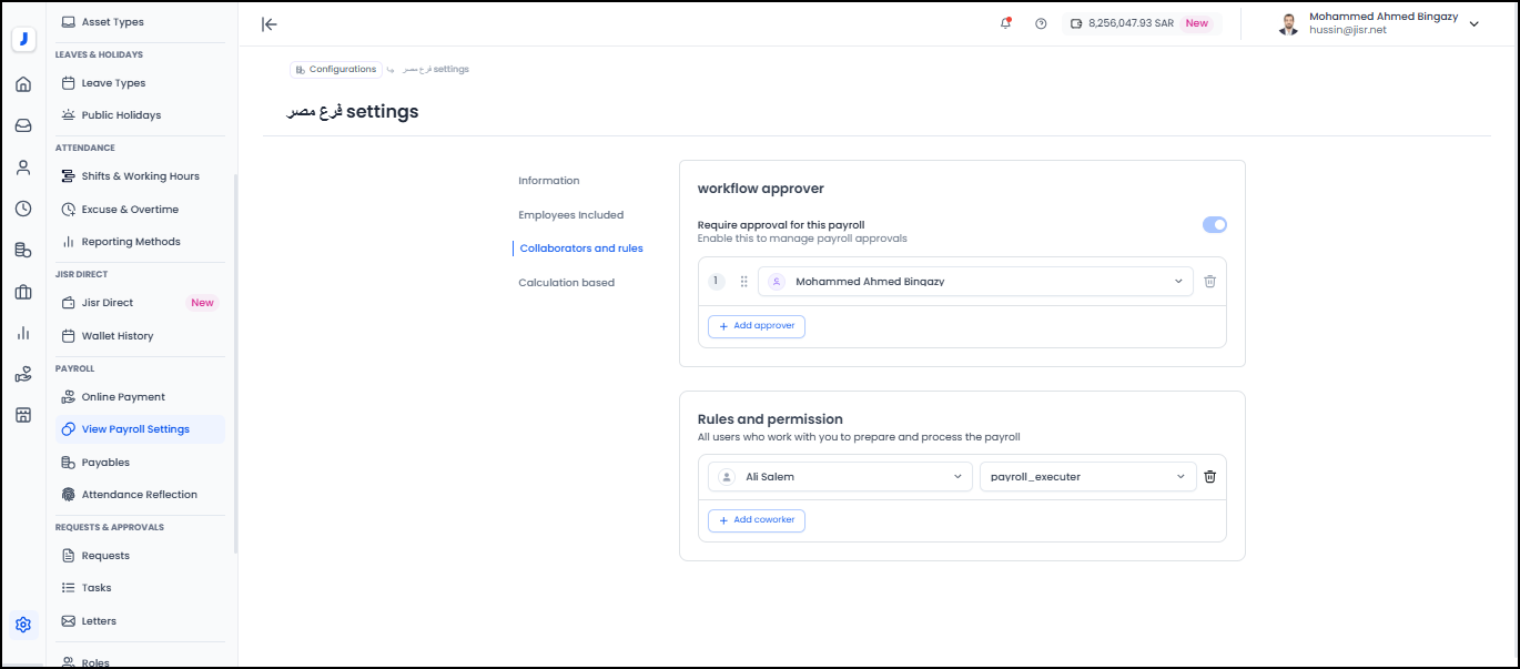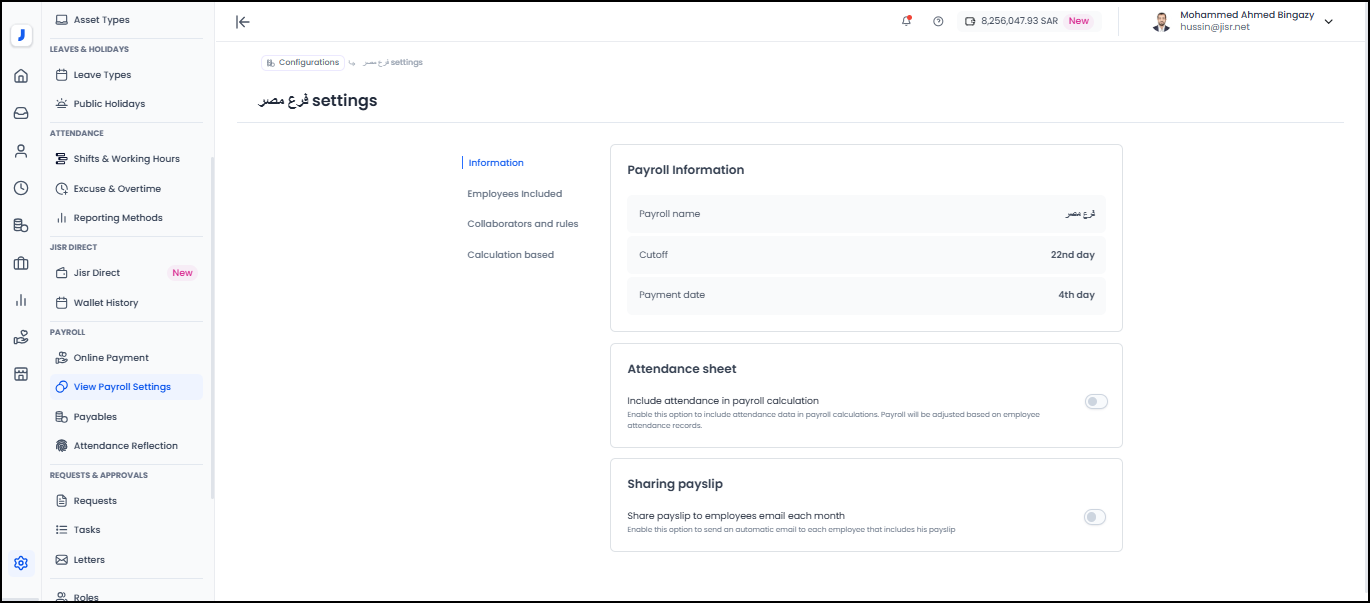 The Jisr system provides the user with the ability to prepare special settings for each payroll in the system. These settings differ from the general settings on the payrolls in the Jisr system, which you can view here.