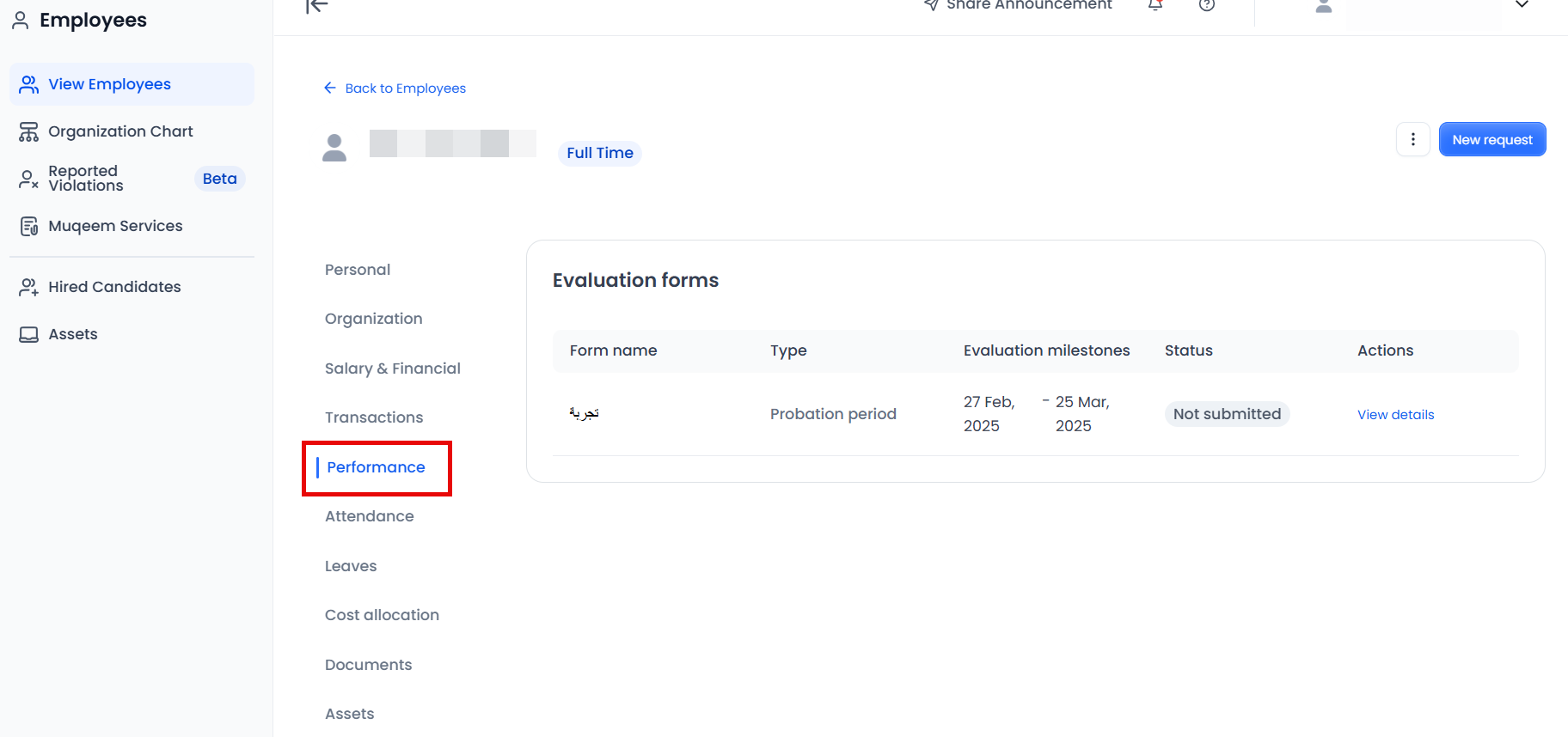 - In the new experience, evaluation templates are reflected in the employee's profile and displayed there. So, when an employee is added to an evaluation template, the template name, status, and details are added to the employee’s profile, allowing managers and admins to easily track their performance.