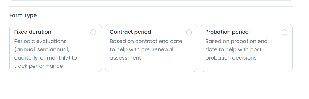 - Normal review cycles (Annually, Semi-annually, Quarterly): These will be converted into fixed-duration evaluation templates with the same frequency (Annually, Semi-annually, Quarterly).