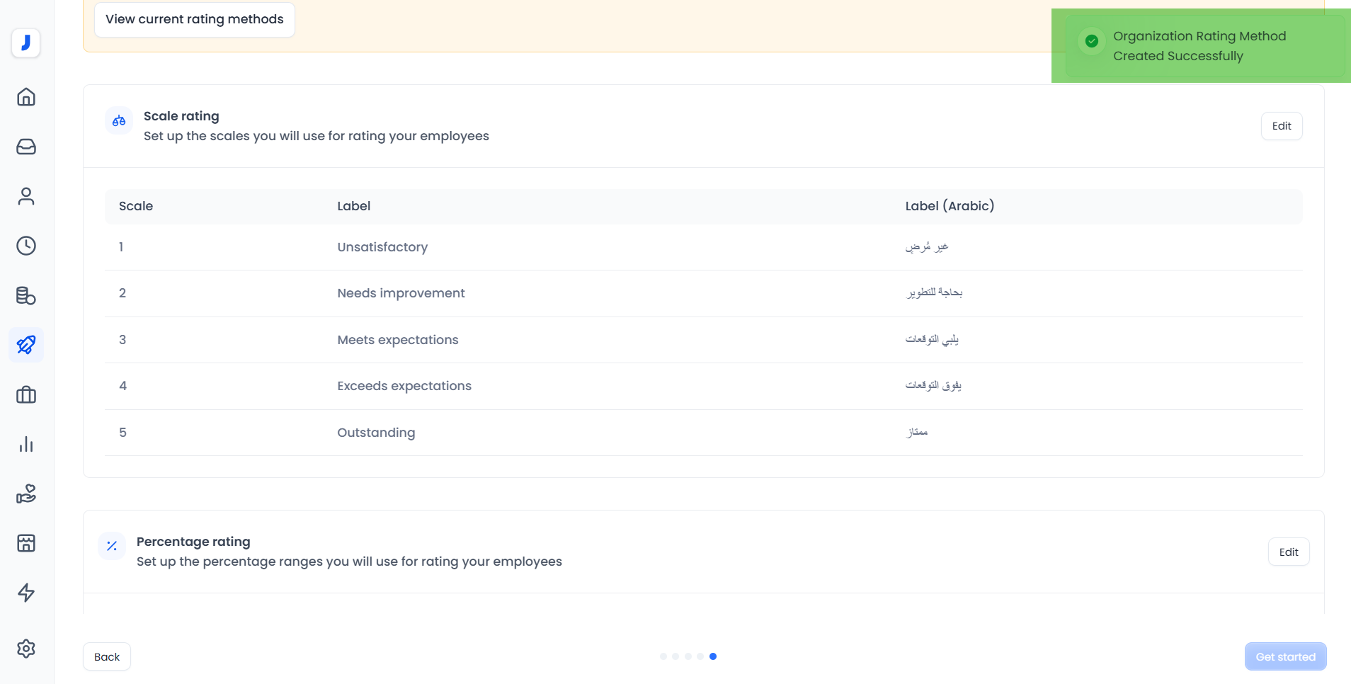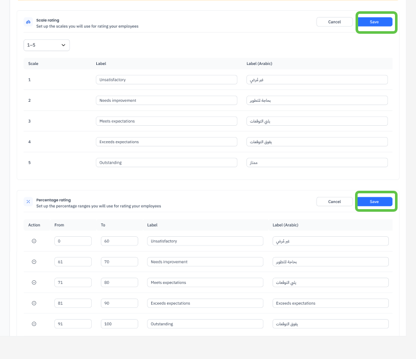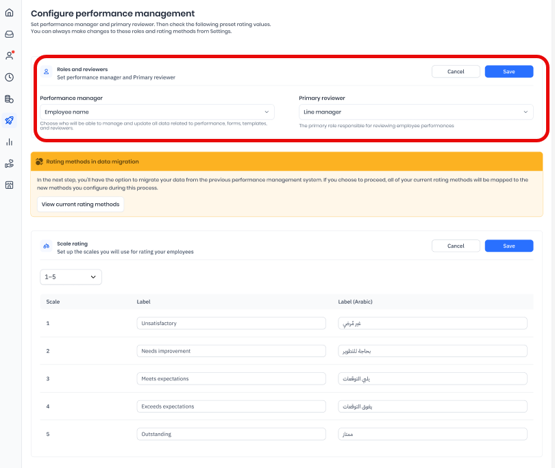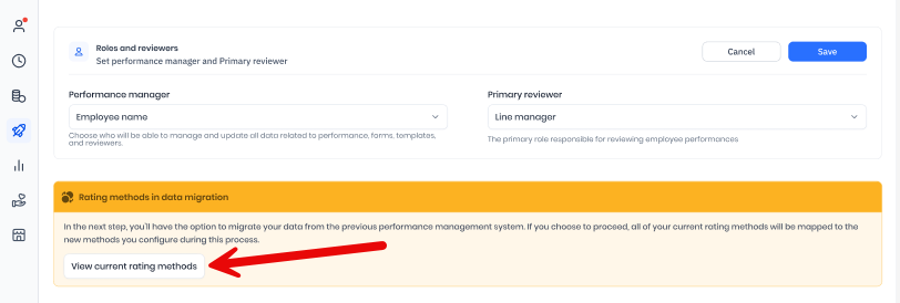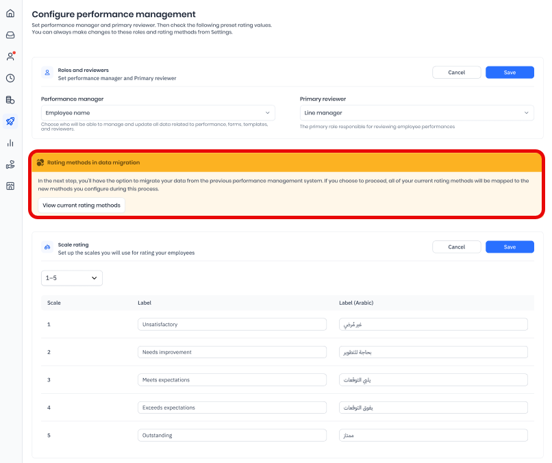 The data for your evaluations added in the current performance management system will not appear in the same method (scales, percentages, or labels) in the new performance management system. Instead, these evaluations will appear with the new evaluation method you saved on this page. You will not be able to go back and change them, as the migration process will have already been completed. Any updates to the evaluation rating methods in the settings will only apply to any new or upcoming evaluations.