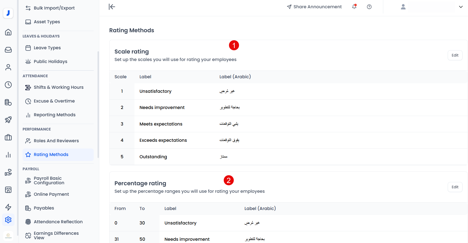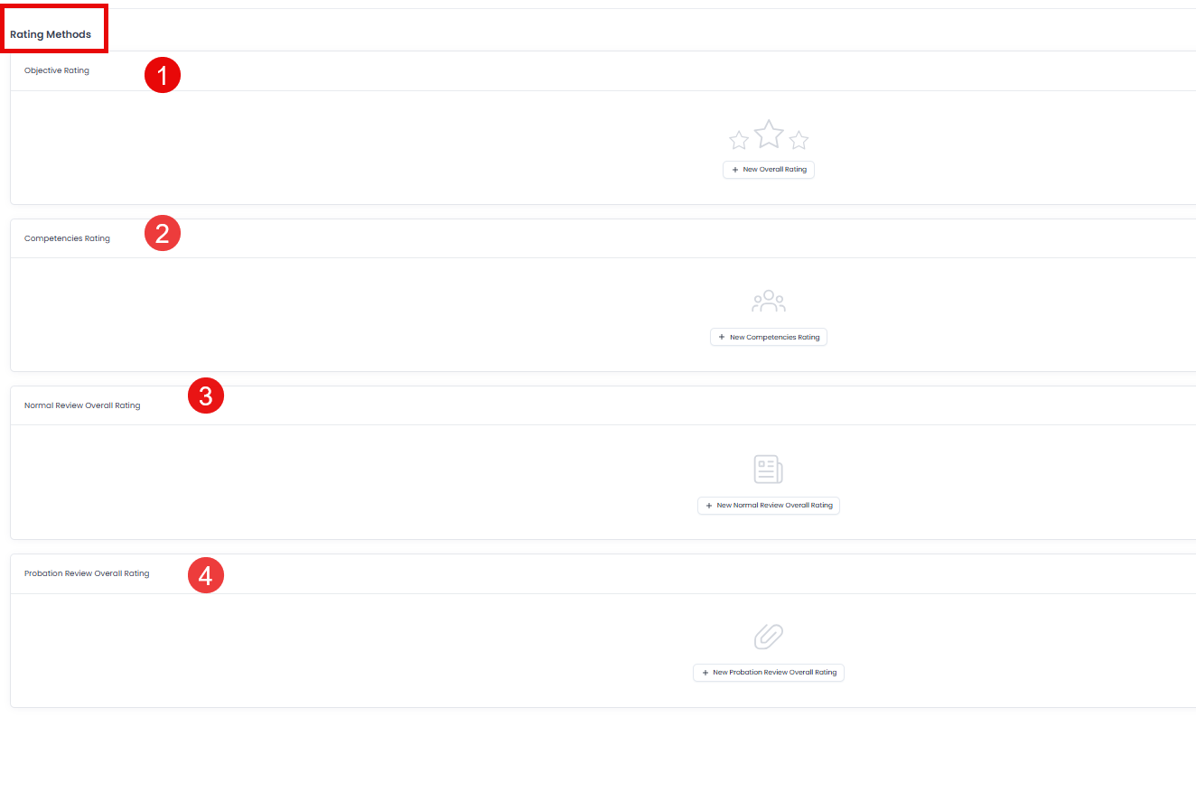 - In the current performance management system, there are 4 performance evaluation rating methods: (Objective Evaluation, Competencies rating, Normal Review Overall Rating, probation review overall rating). You can choose whether each of them is evaluated by (scale or percentage).