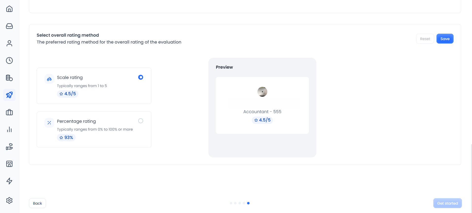 When clicking on "Performance" from the homepage, introductory steps will be displayed, explaining the features of the new performance experience. You will click "Next" until you reach the "Rating Methods Set up" page.