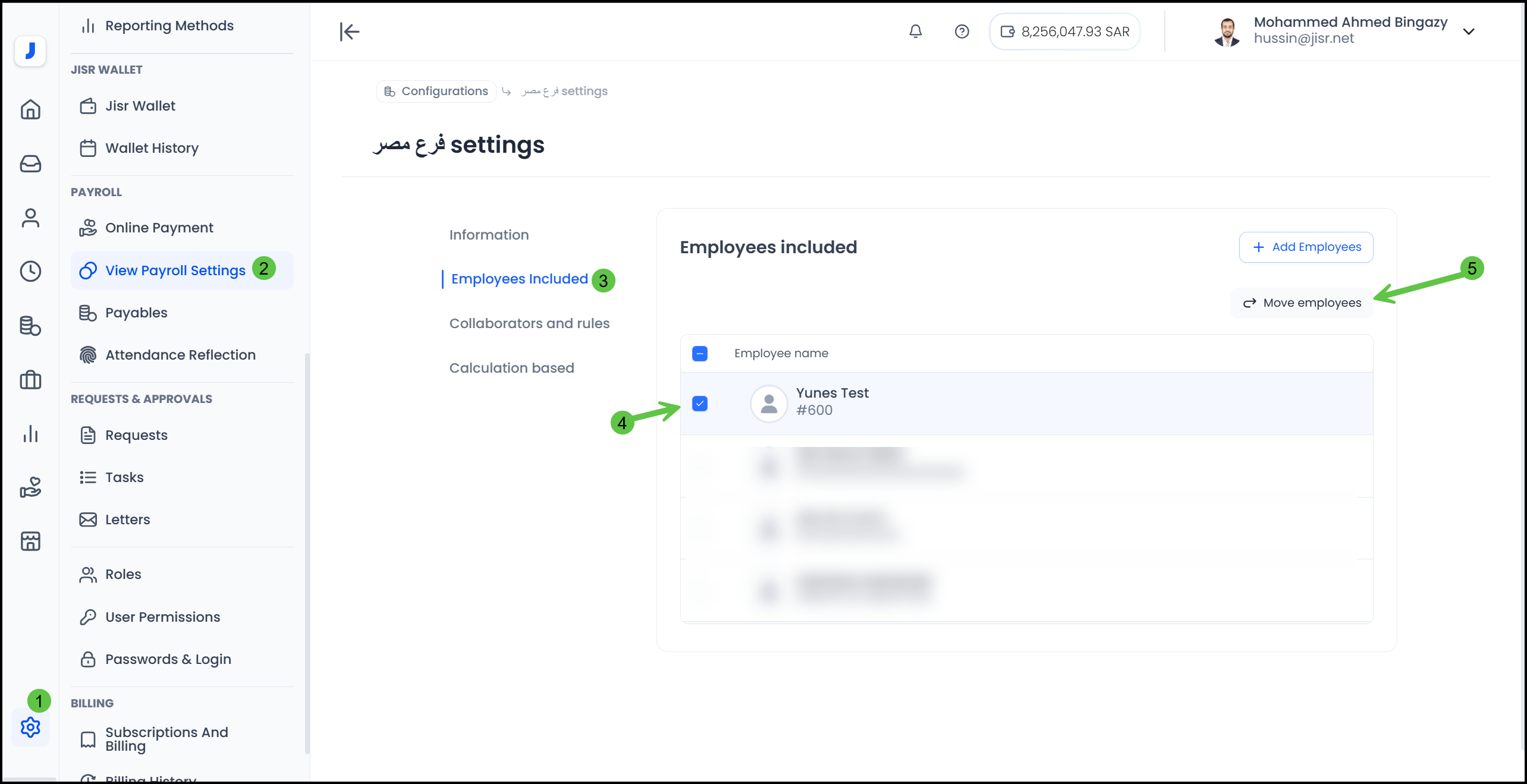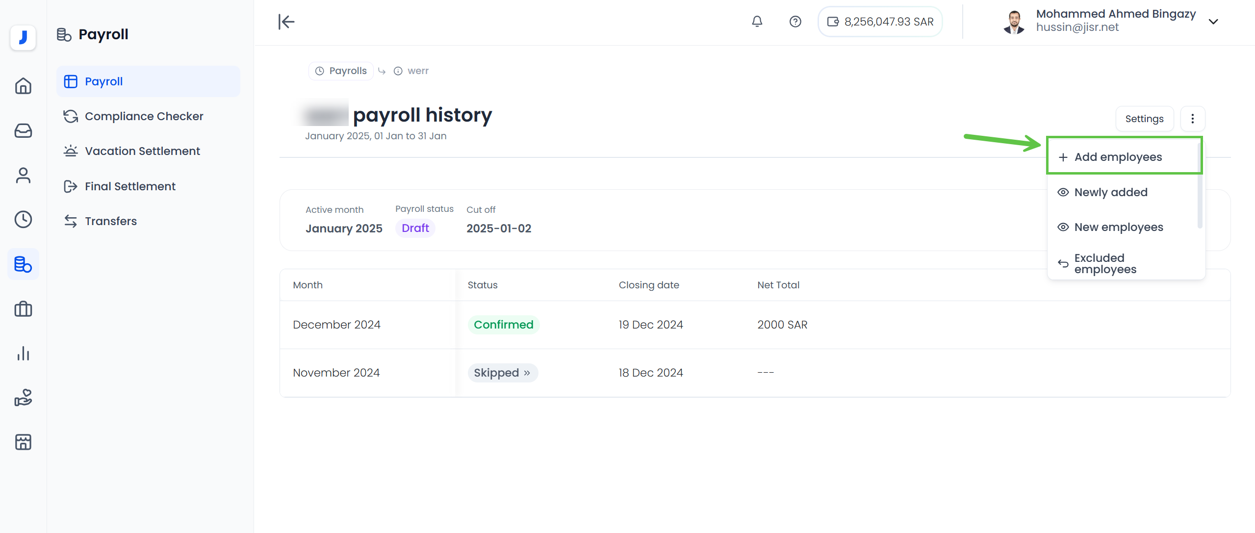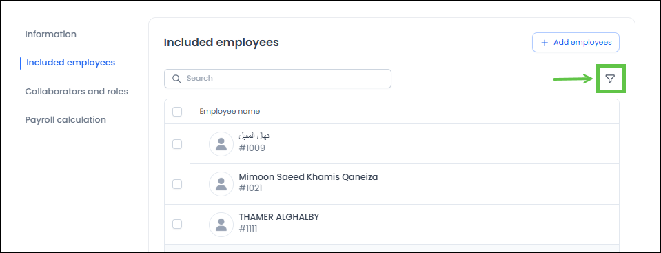 1. The user with the authority (payroll admin) goes to the payroll from which employees are to be transferred, then clicks on settings and navigates to the 'Employees included' tab.