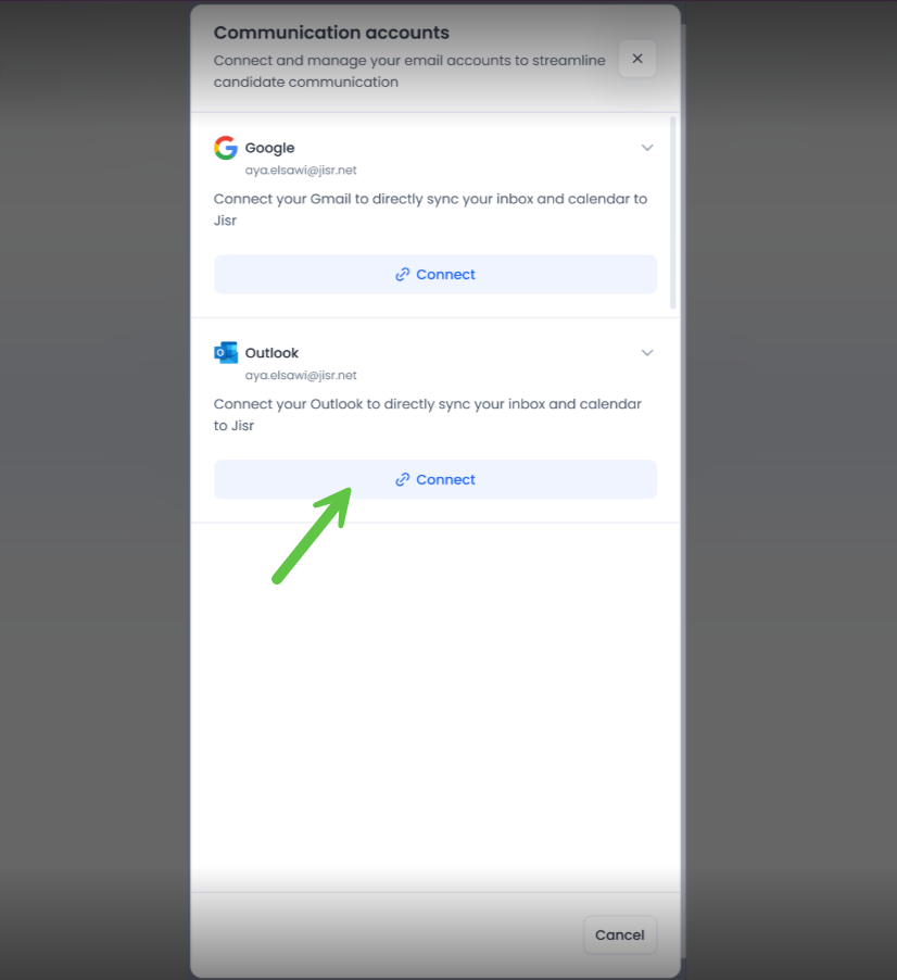 3. To integrate your Outlook account with Jisr, click on 'Connect' under Outlook.