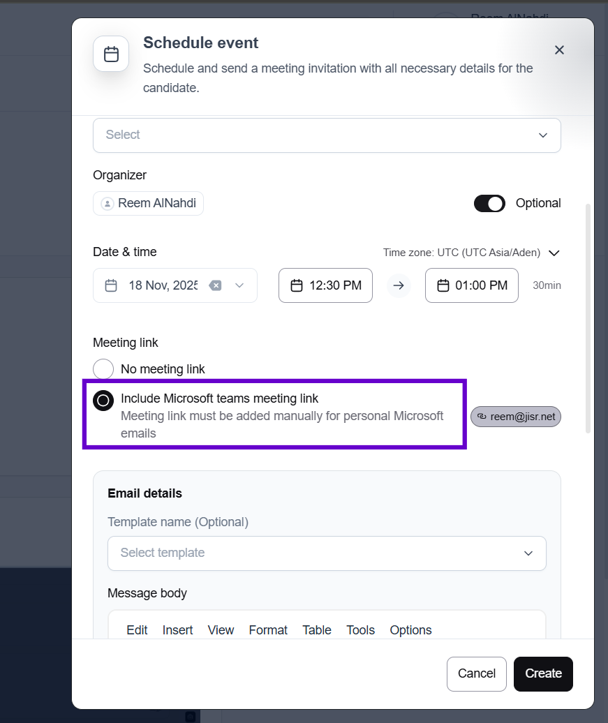 5. Once integrated, Outlook will be linked to your Jisr account. From then on, any scheduled events can automatically include a Microsoft teams link.