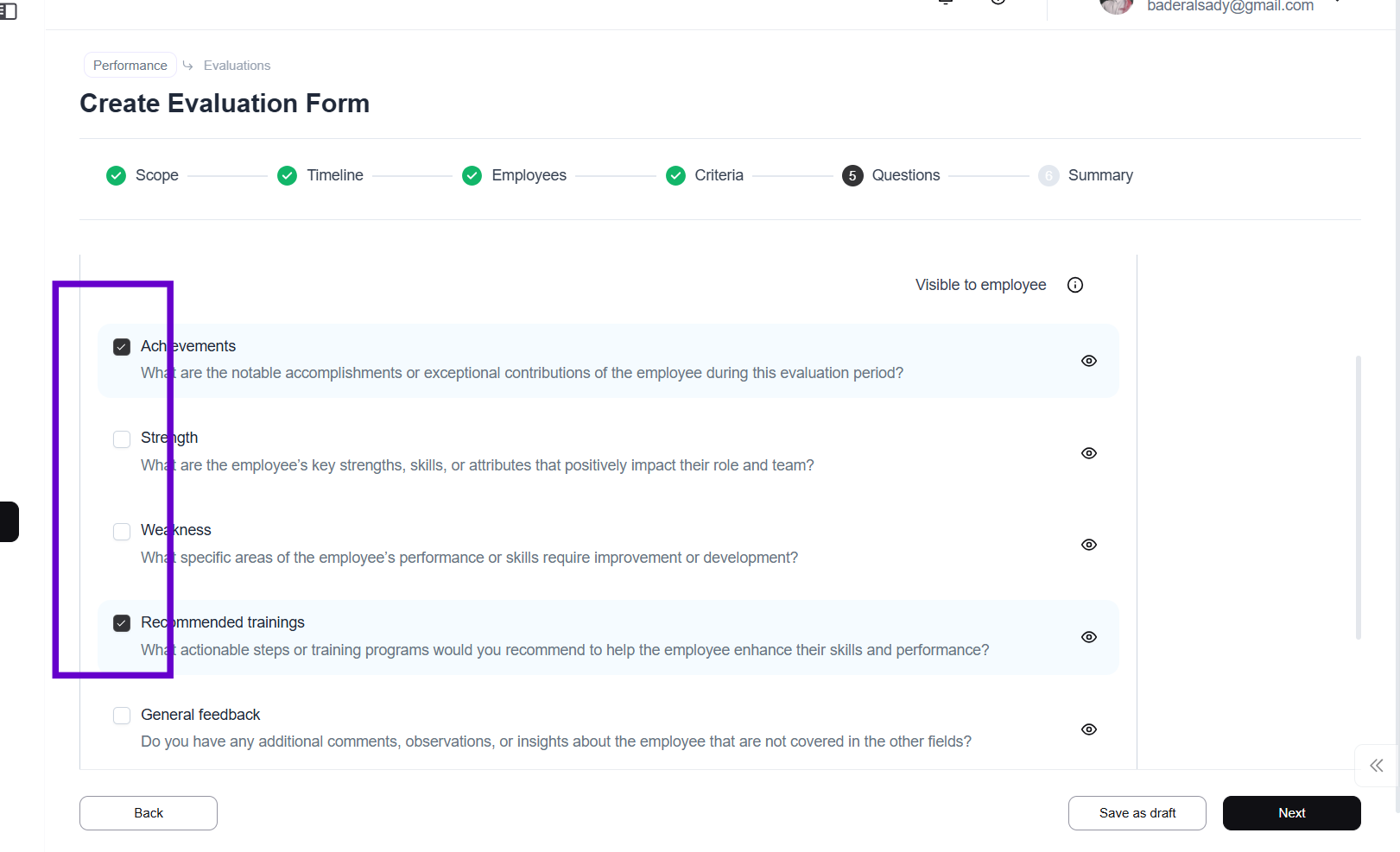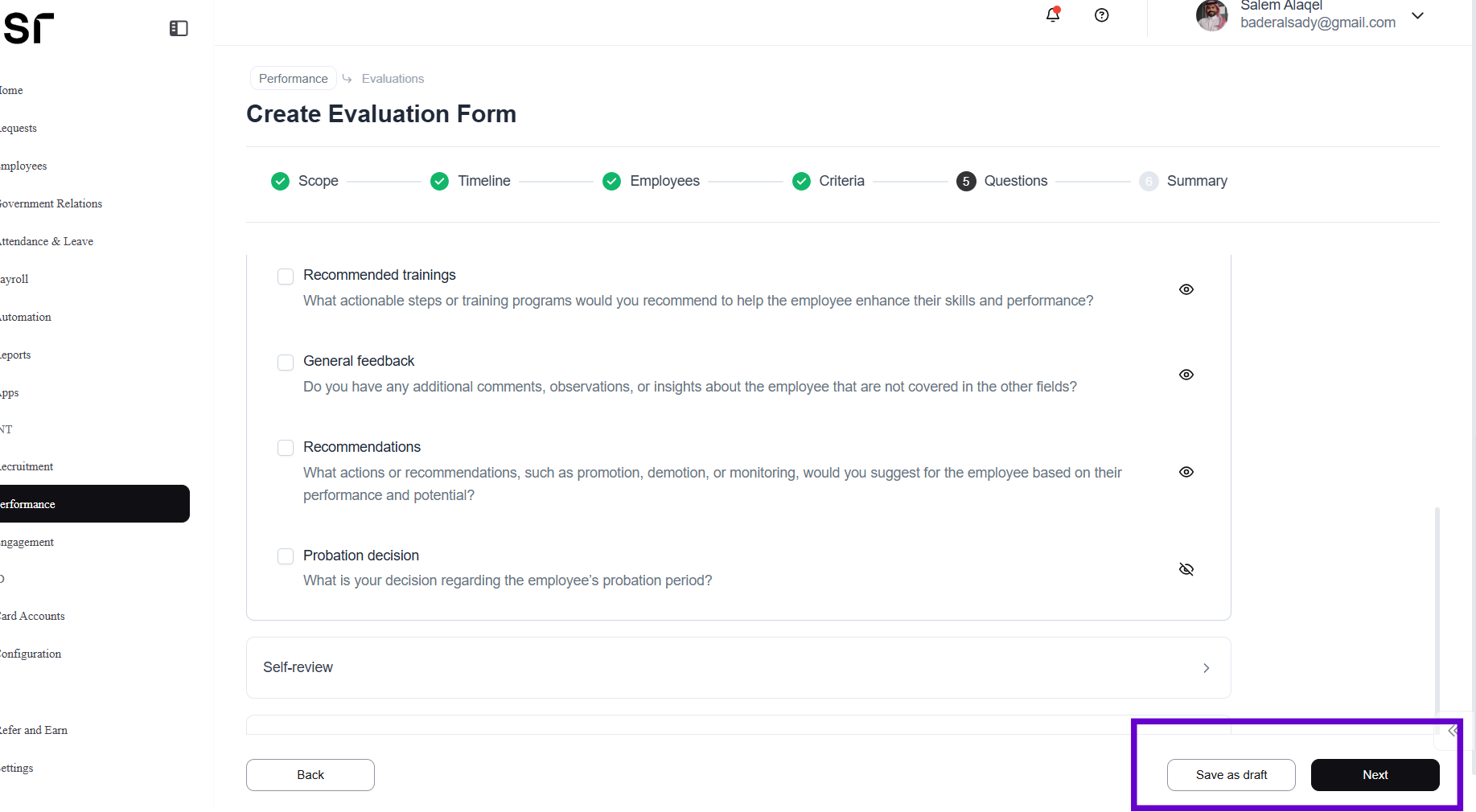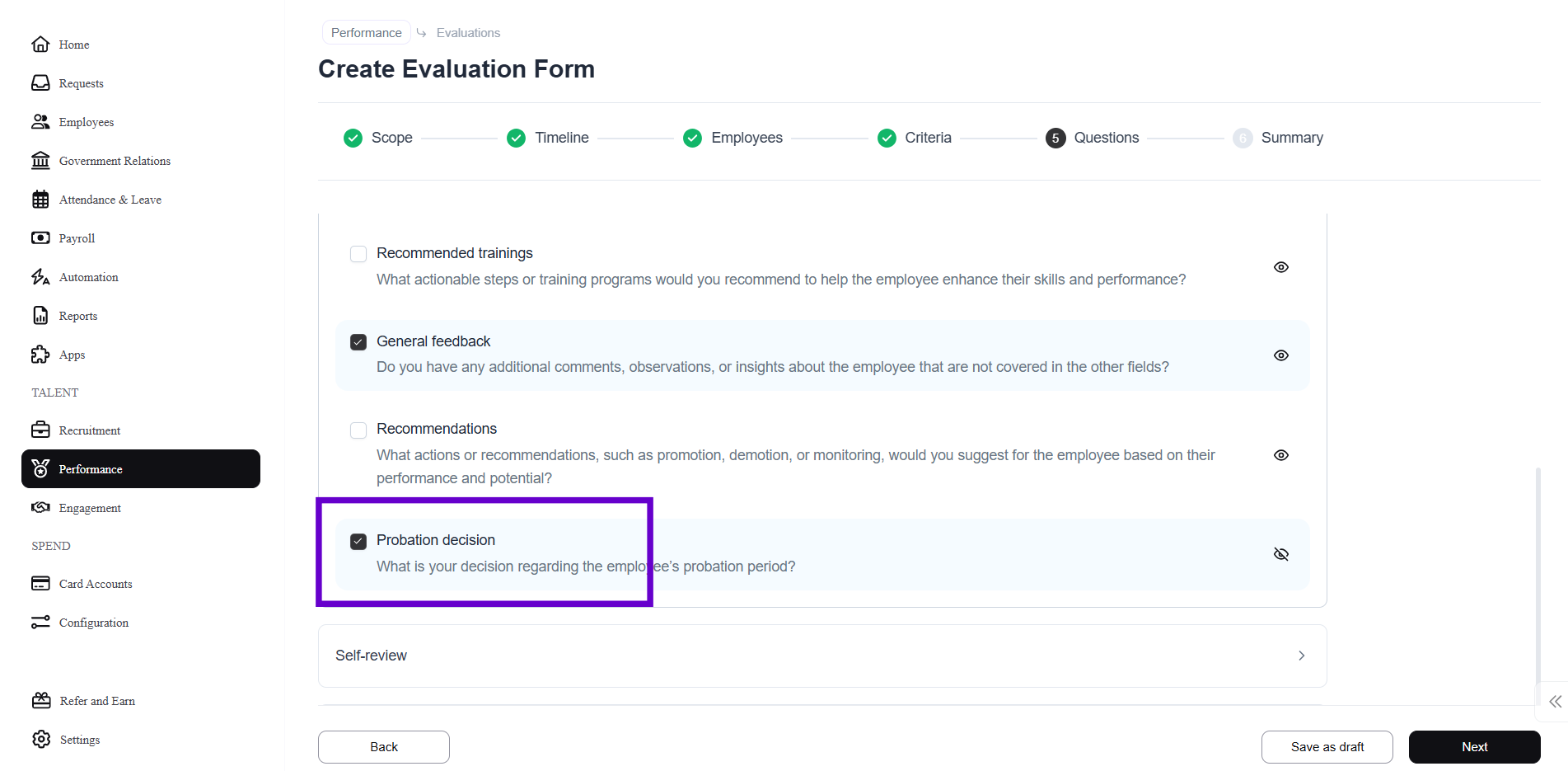 This step, and the type of questions added in it, varies depending on the evaluation period model (Calendar Year, Contract Period, Probation Period, Fixed Duration) as well as the evaluation types selected (Self, Upward, Downward Feedback).