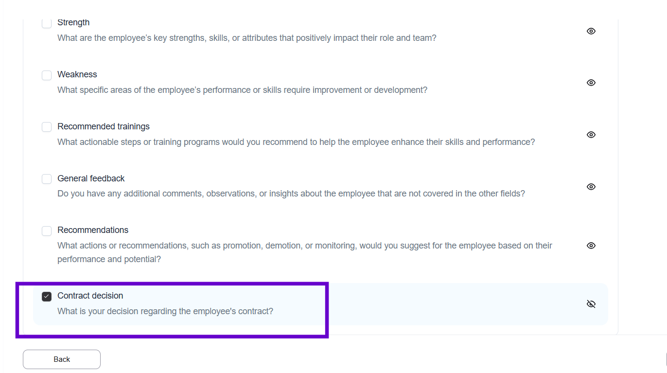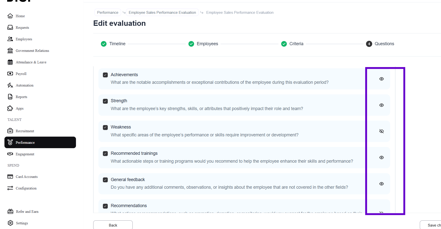 - Users can choose to enable or hide any question from the employee being evaluated in Downward, and Peer feedback.