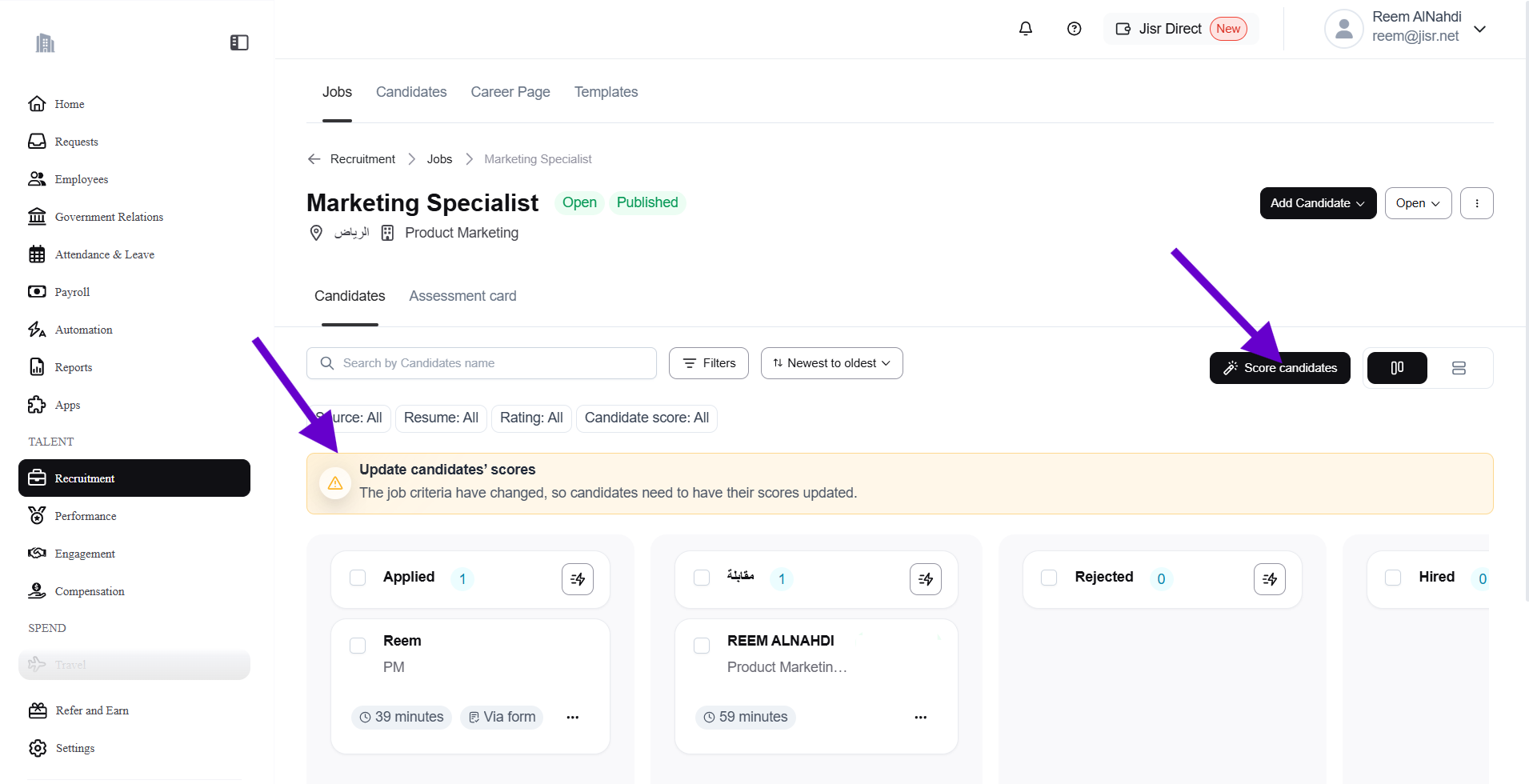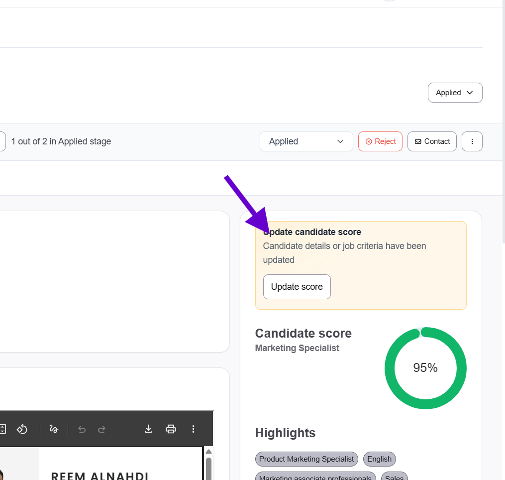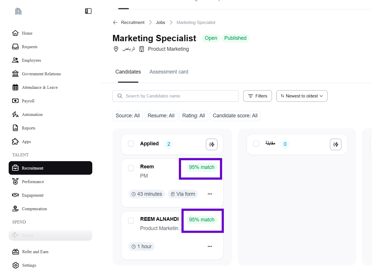Once the score percentage appears next to the candidates, the recruiter can easily identify those with the highest match to the job requirements based on their résumés.