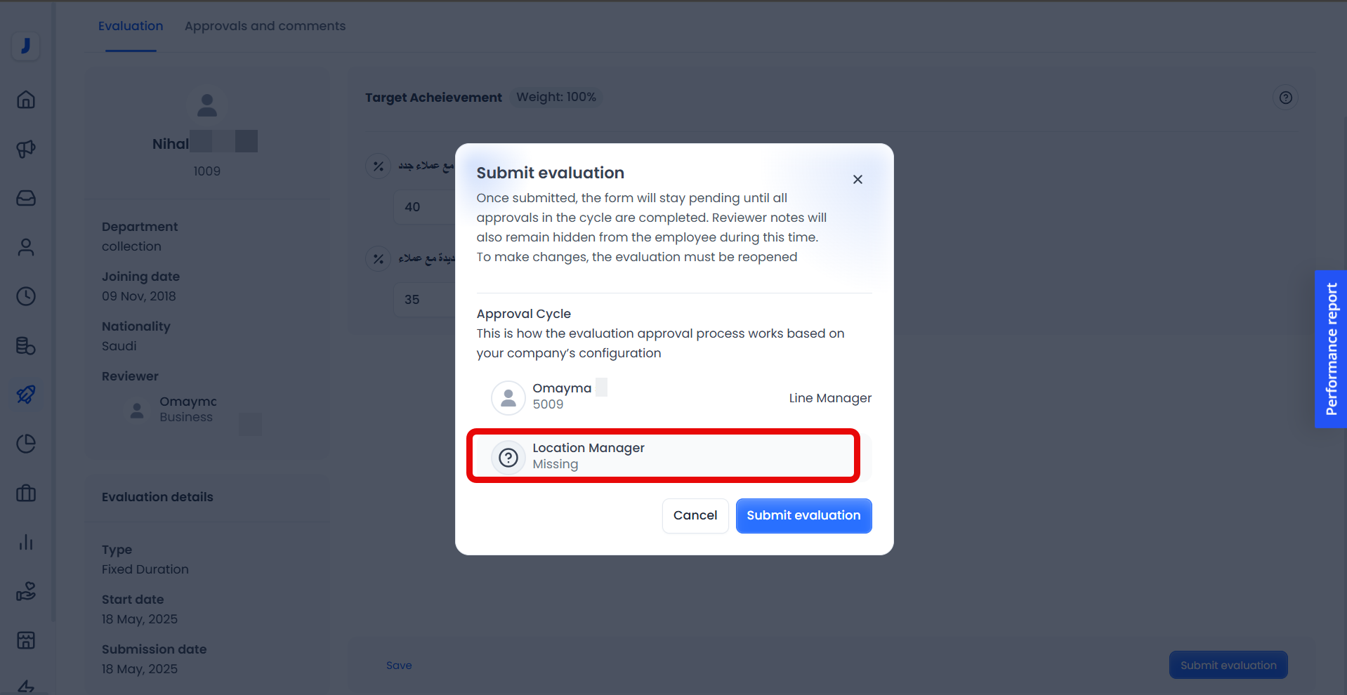For example, if (the second approver) in the cycle is the “Branch Manager” and the branch manager for the employees in the evaluation form has not yet been assigned in the system, this step will be automatically skipped. The system will either move the evaluation to the next available approver in the cycle or confirm it based on the approval of the first approver and immediately share it with the employees.