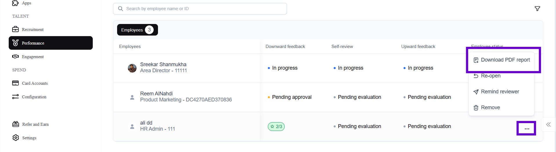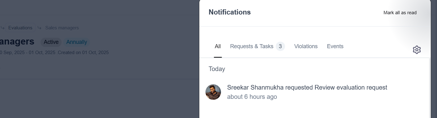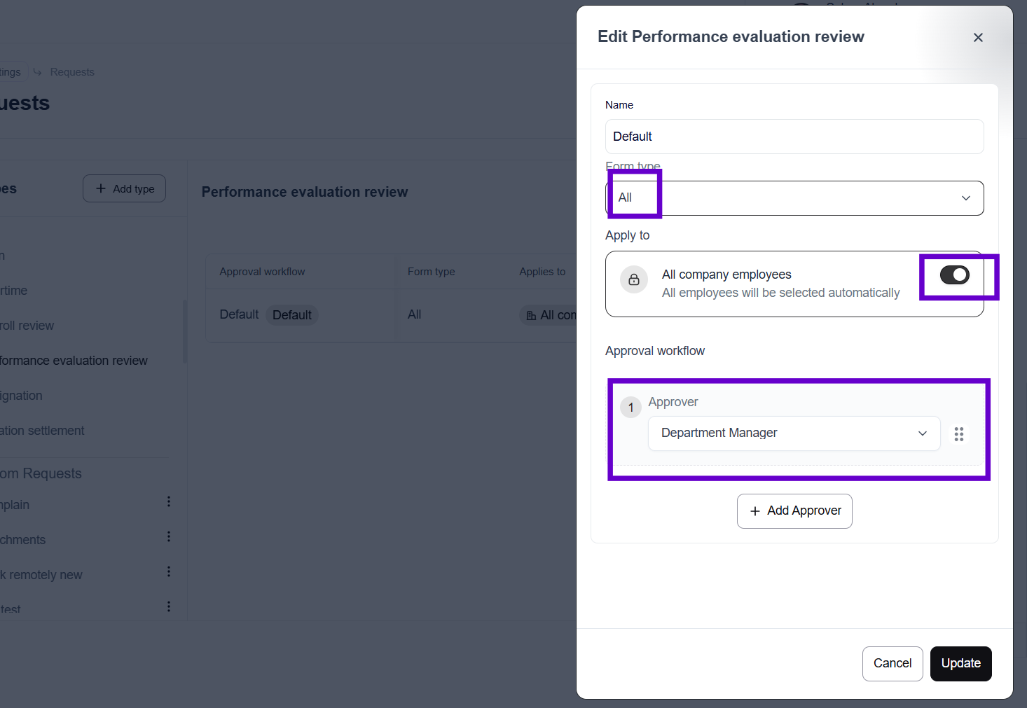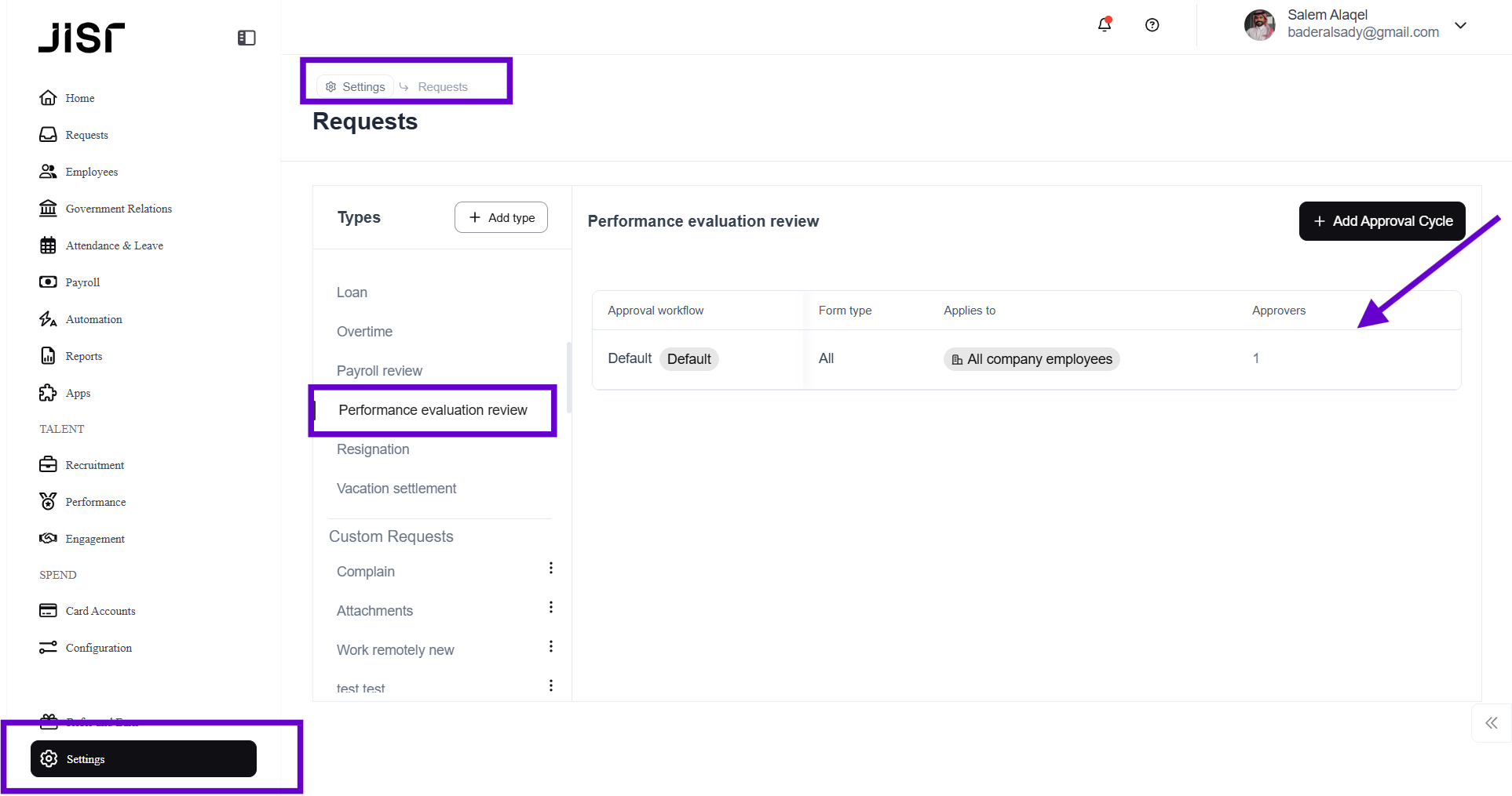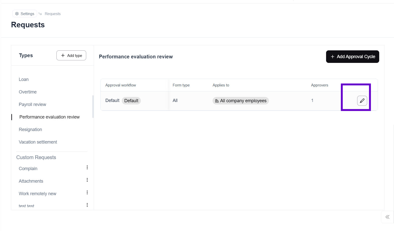 Admins with the "View Performance Requests" permission — which grants access to performance requests and related approvals — can set up an approval cycle for performance evaluations from the system settings. They can specify the roles responsible for reviewing and approving the evaluation before it is confirmed and sent to employees.