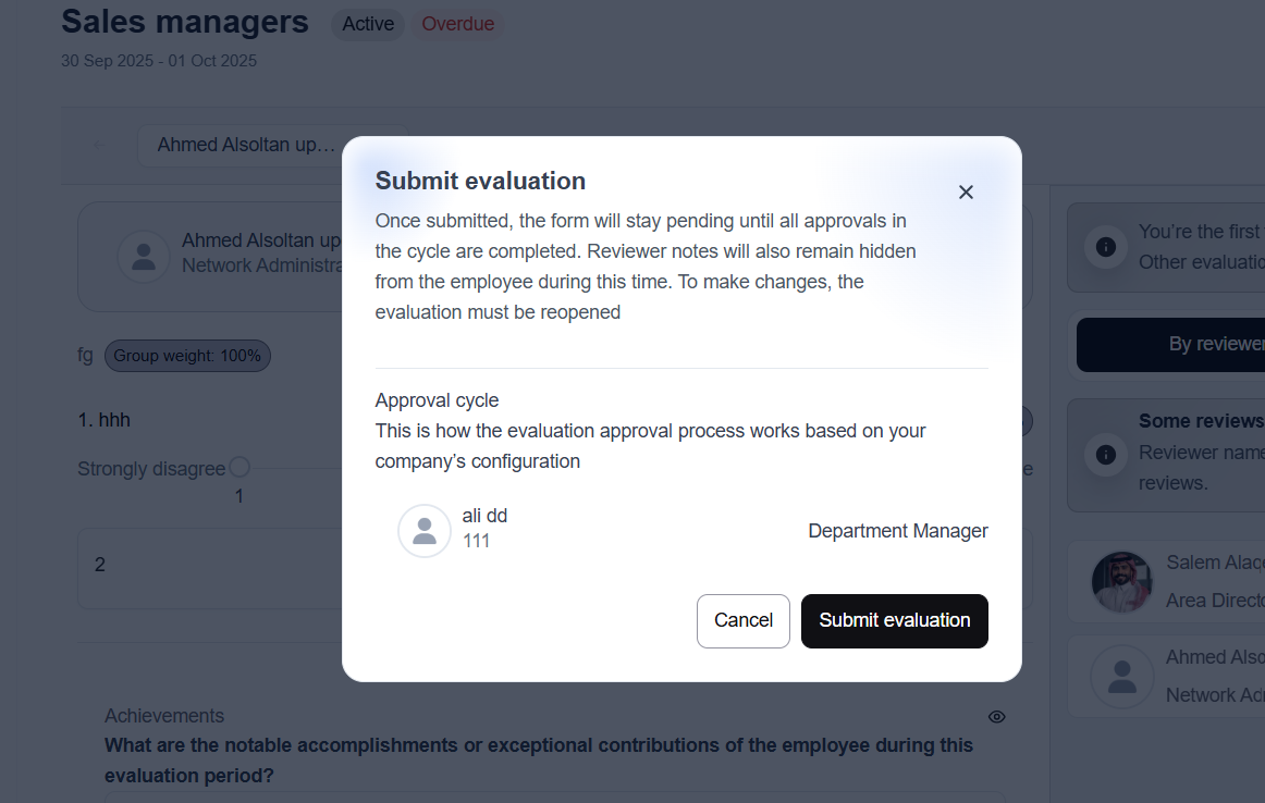 With the system’s ability to add an approval cycle that allows assigning specific approvers (such as a department manager or branch manager) to approve employee evaluations before submission, this will ensure greater: