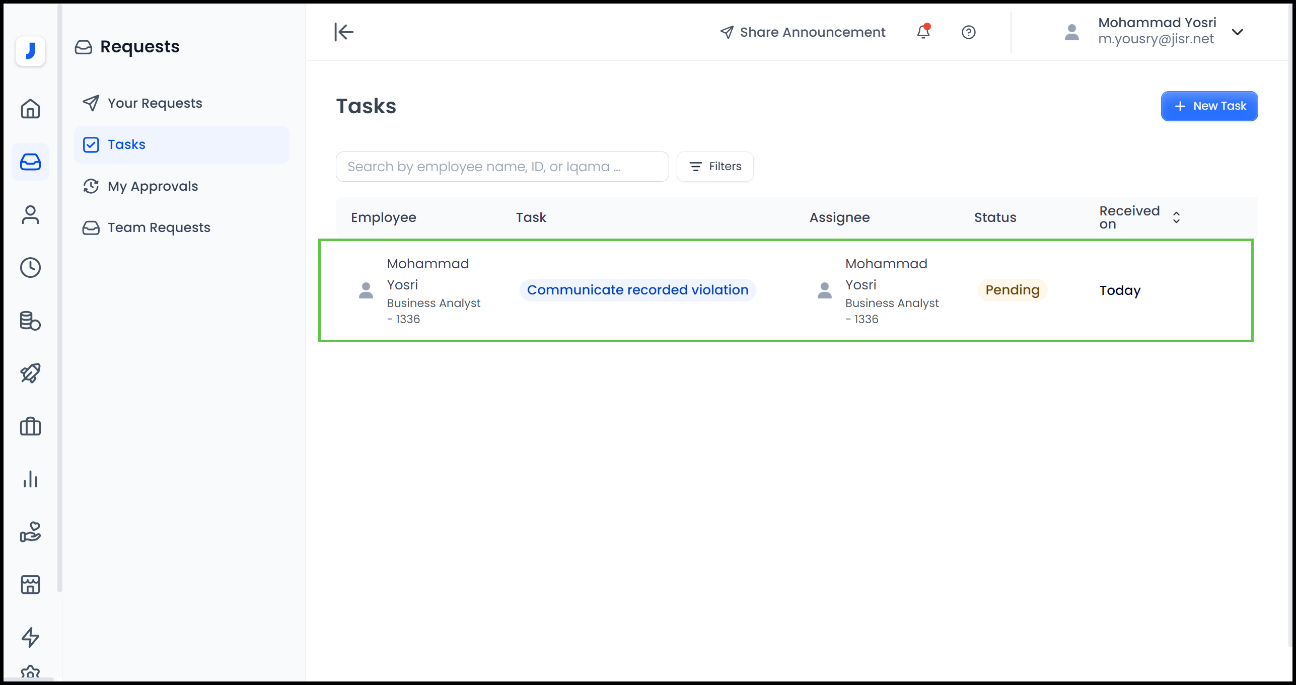 Therefore, it is necessary to clarify how to assign a task to a user in the Jisr system, to be responsible for notifying employees of the violations recorded against them, where a task is created for the responsible person in which he notifies the employee against whom a violation was created.