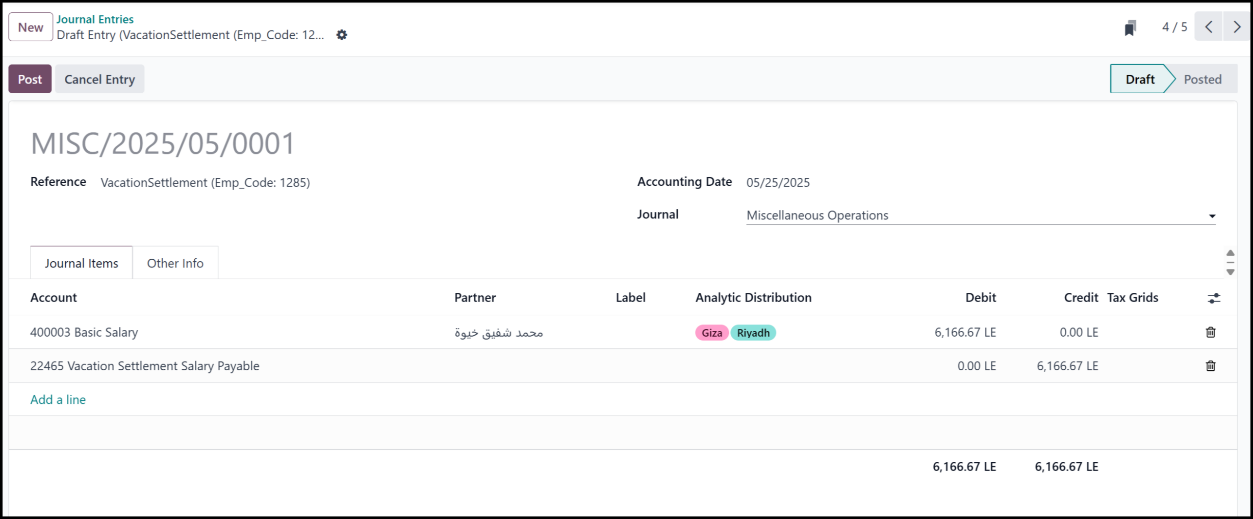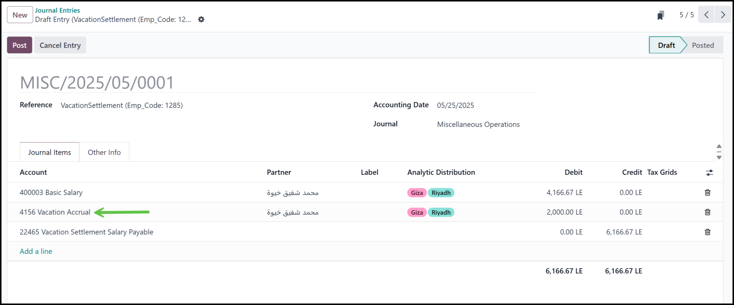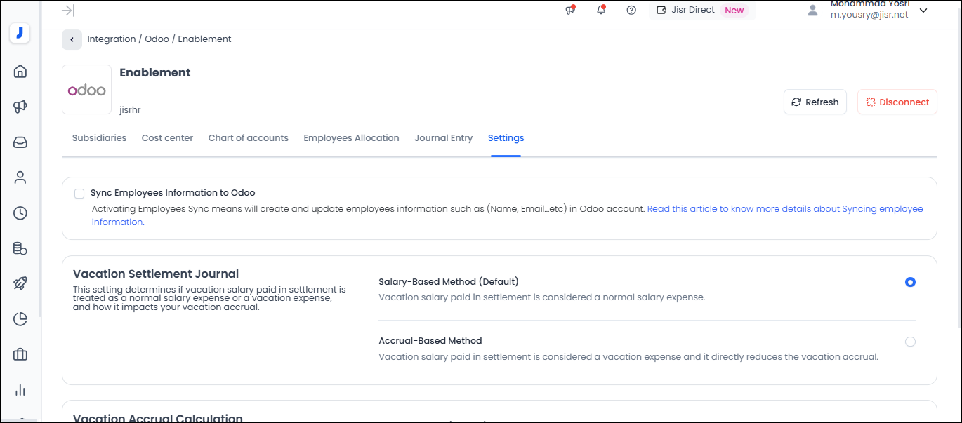 Note: The method of recording vacation settlement journal is selected through the accounting integration settings in the Jisr system.