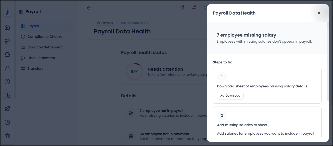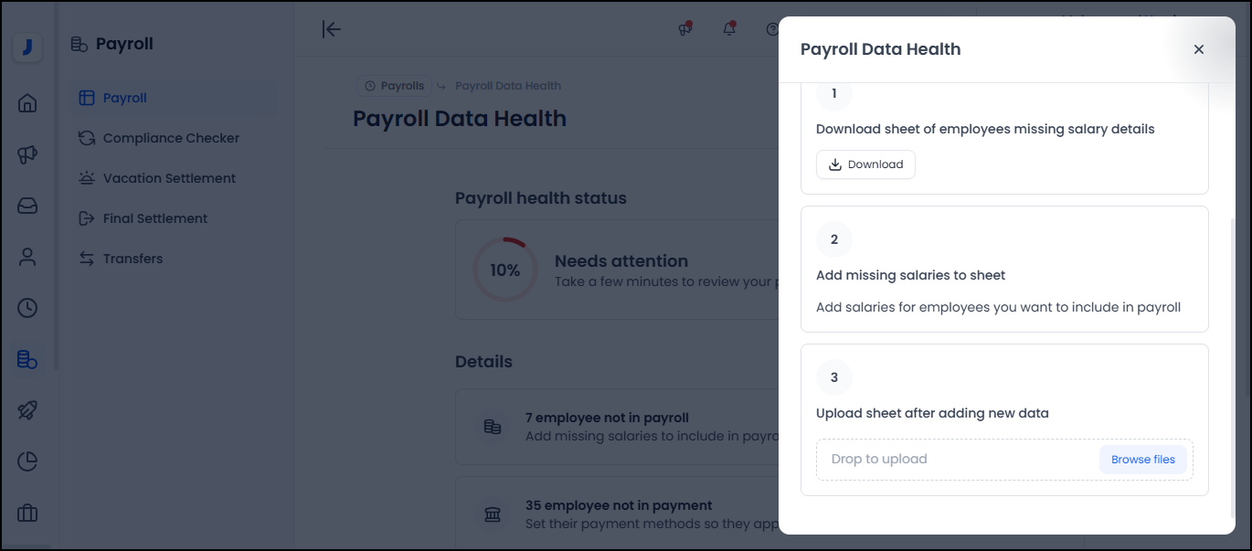 2. At the top of the screen, they will find "Payroll Status," which shows the percentage of completeness of employee data within the payroll.