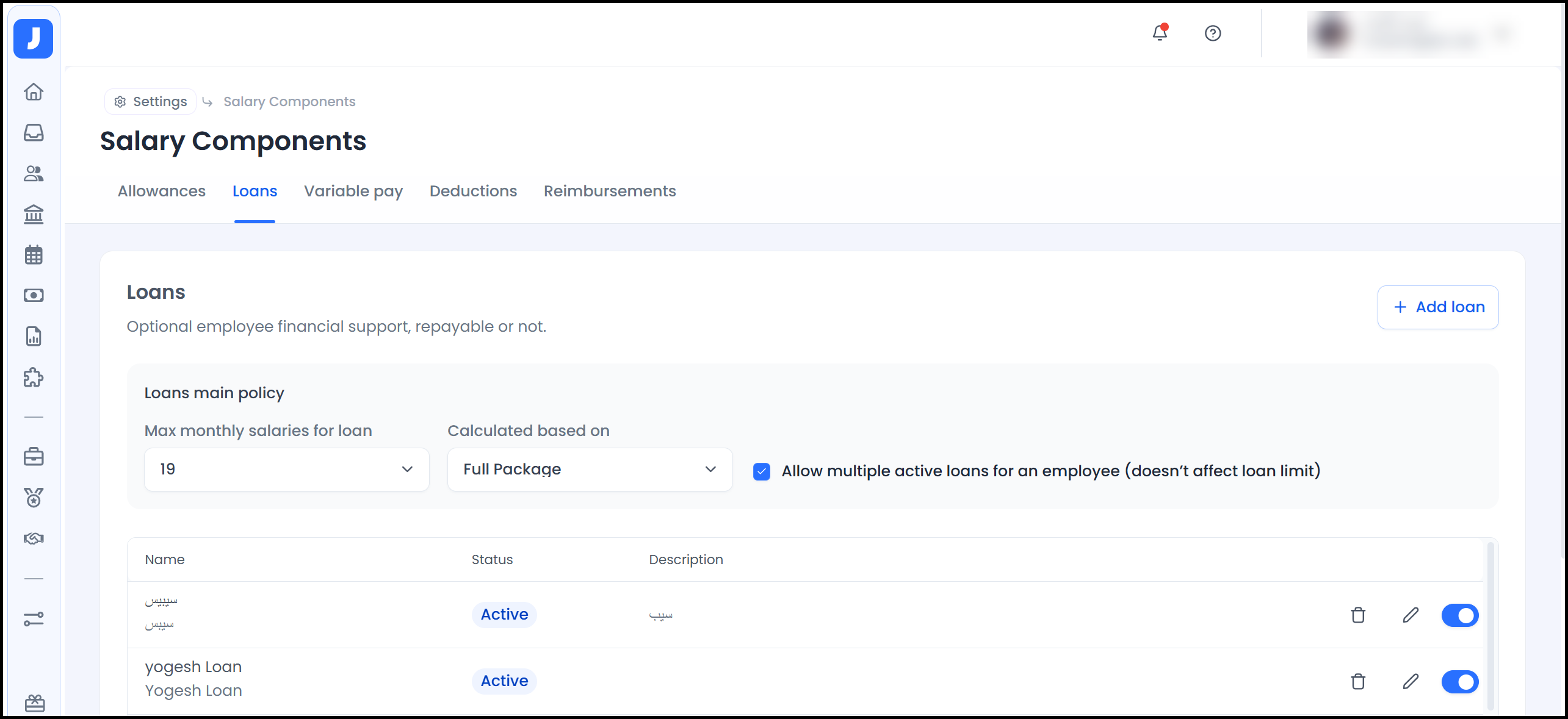 After defining allowances in the system, the user moves to the step of defining Loans.