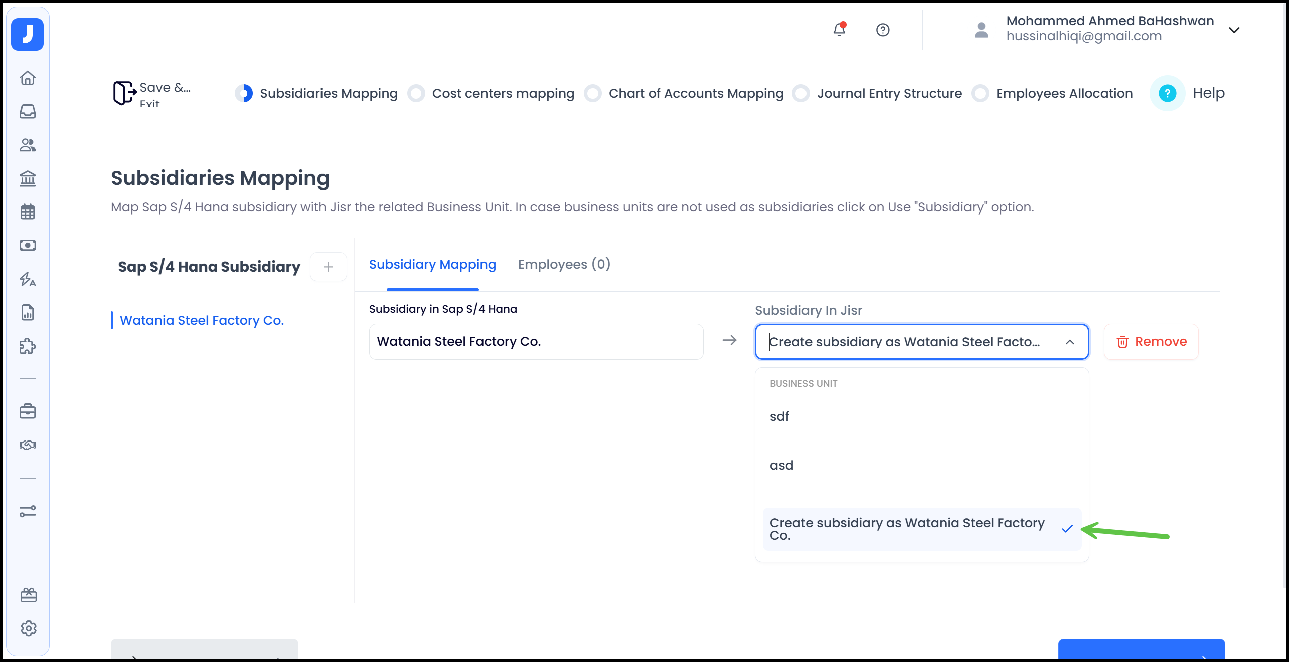 3- Map SAP subsidiary with the related Business Unit from Jisr.