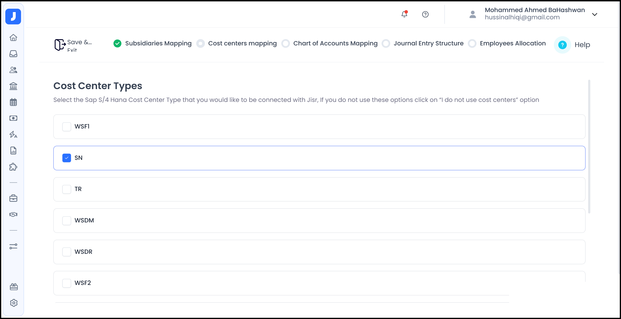Select the SAP Cost Center Type that you would like to be connected with Jisr.