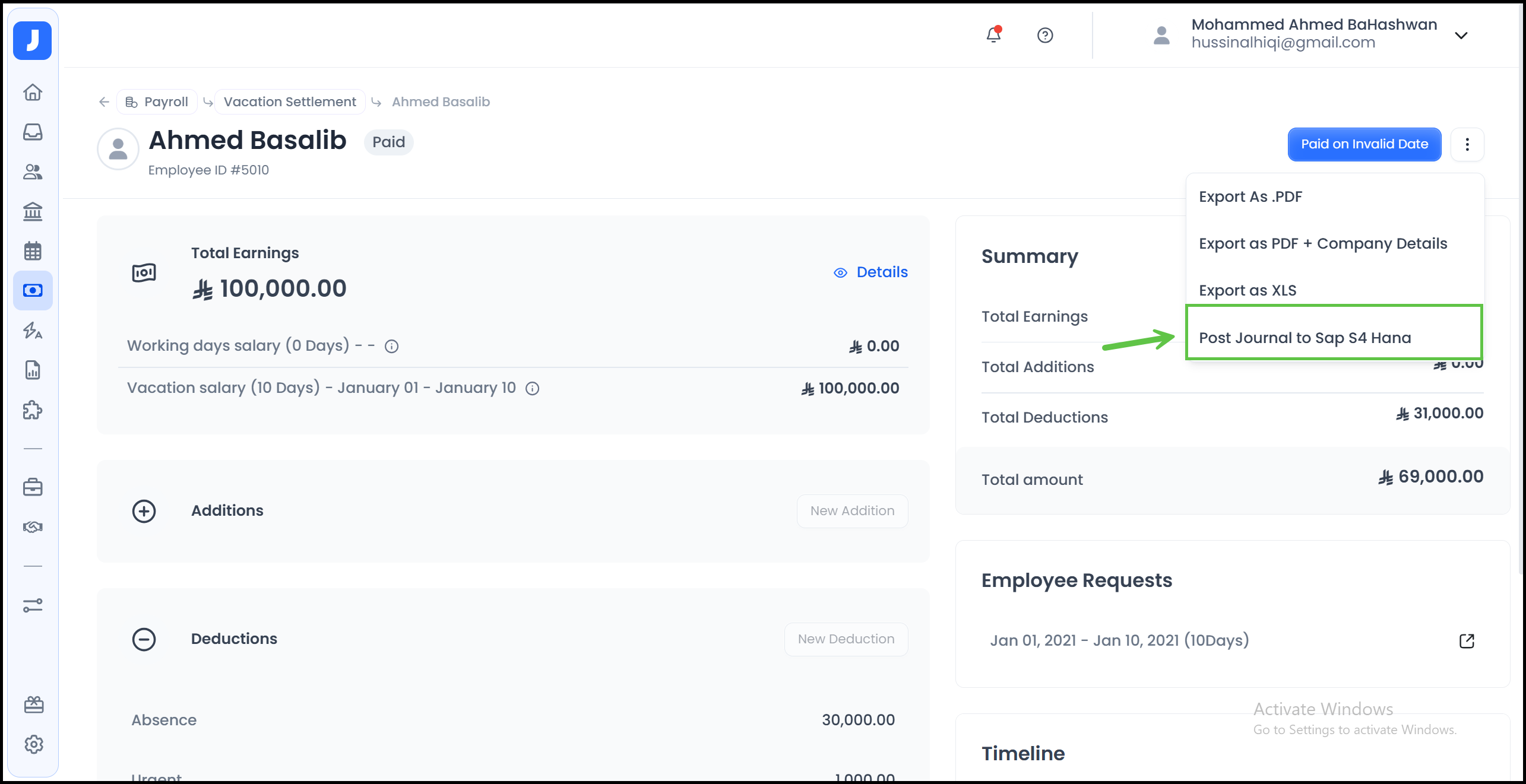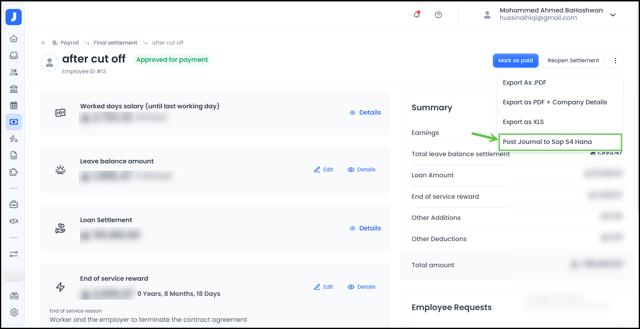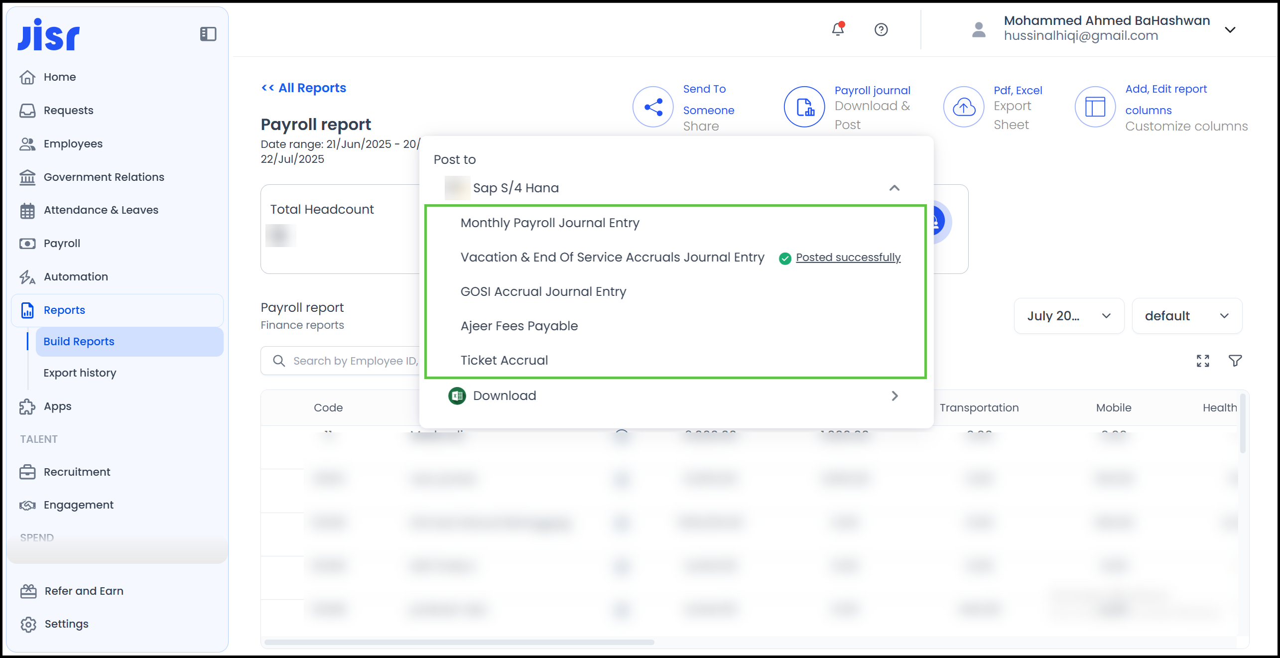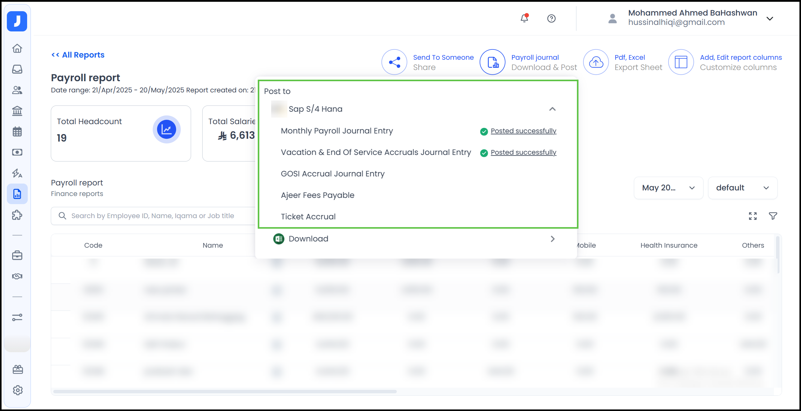 Once the integration setup has been completed, The admin or finance team member who has permission will be able to post the journal entries directly from Jisr to SAP S/4HANA, to ensure all transactions are logged to the GL accounts with less time and effort.