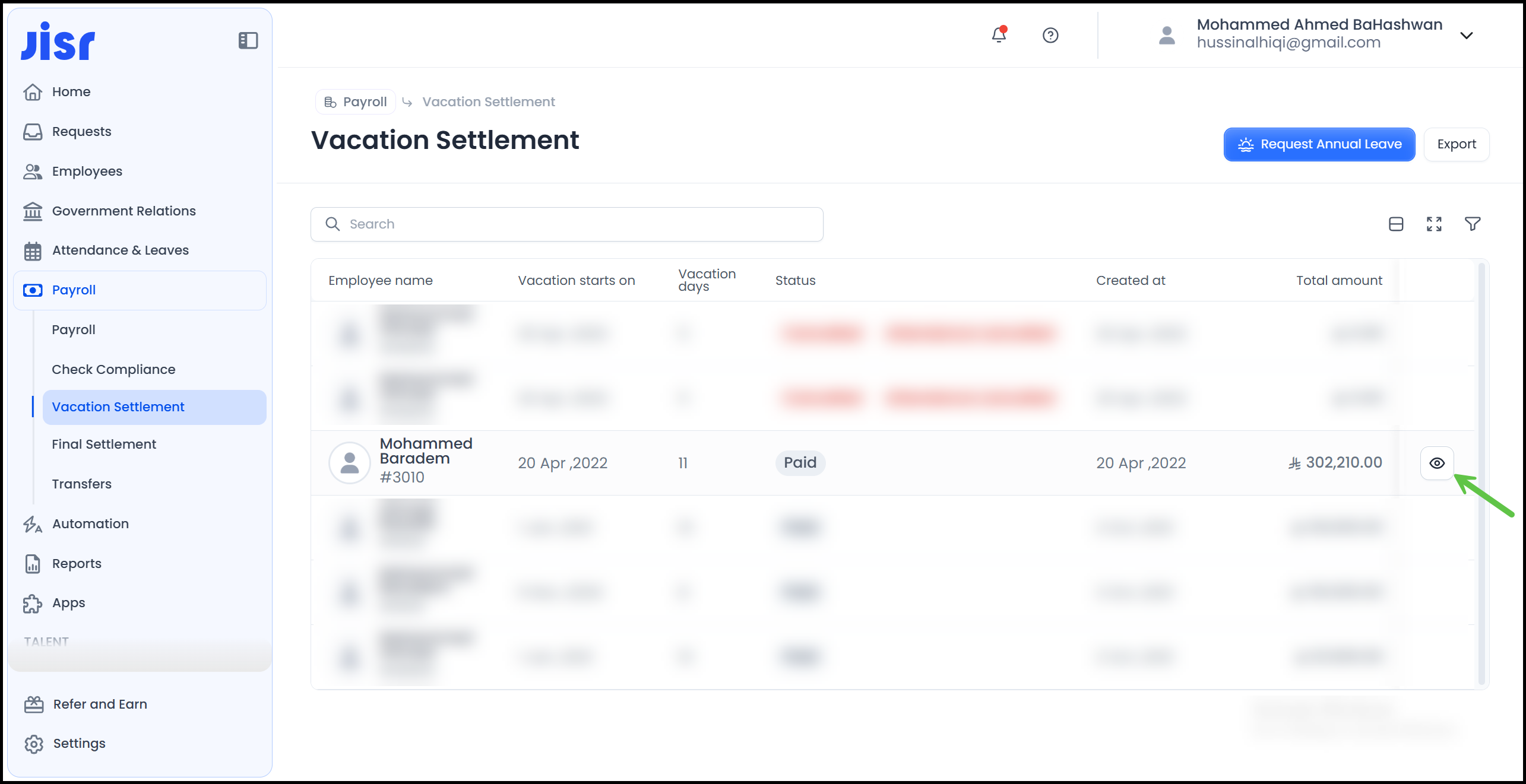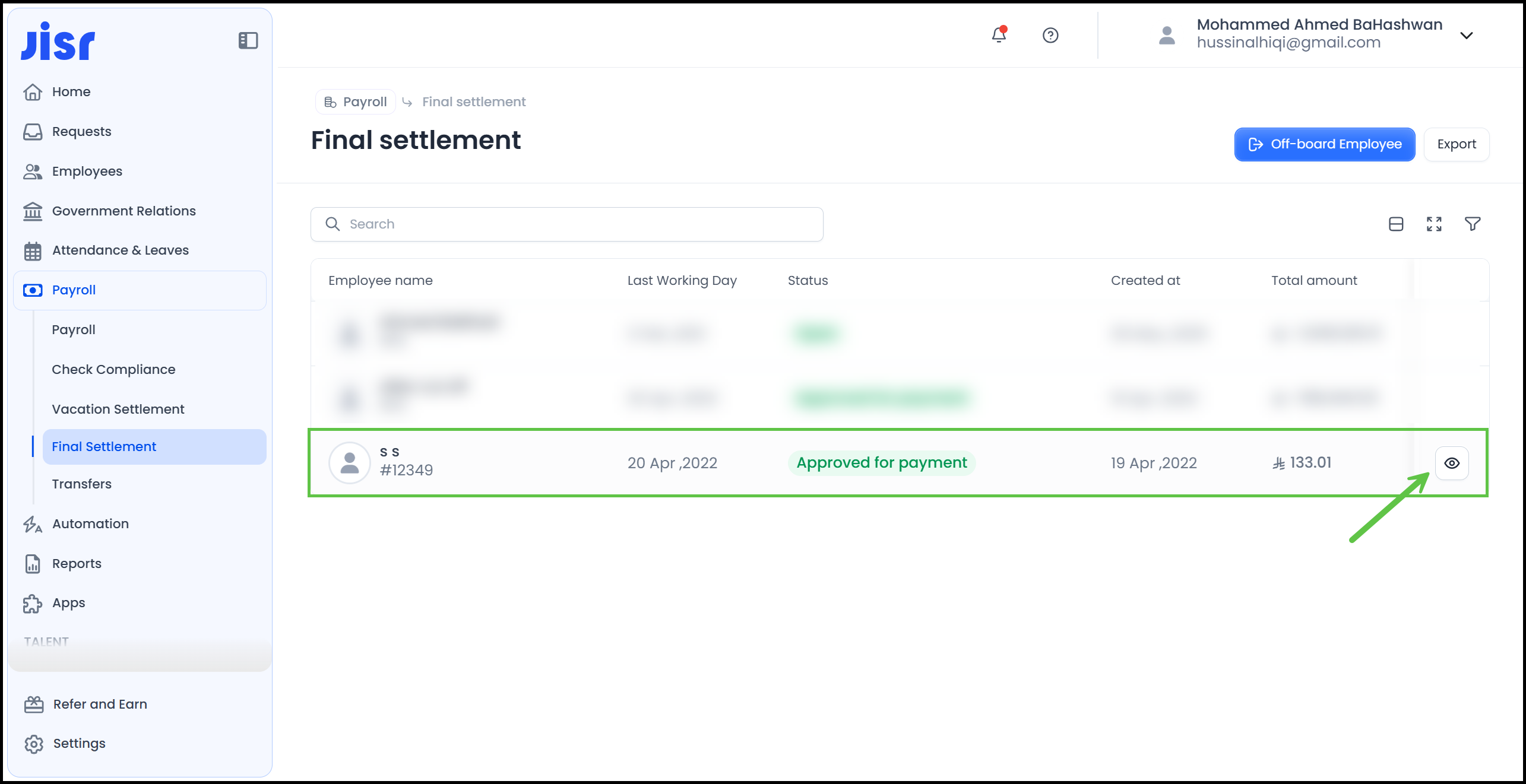 On the left side menu, Payroll > Final Settlement > Approved or paid Tab > Select the required Settlement > click on View details.