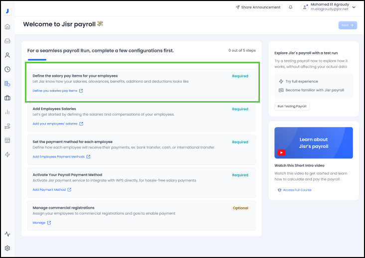 When the user accesses the payroll, they click "Define the salary components for your employees."