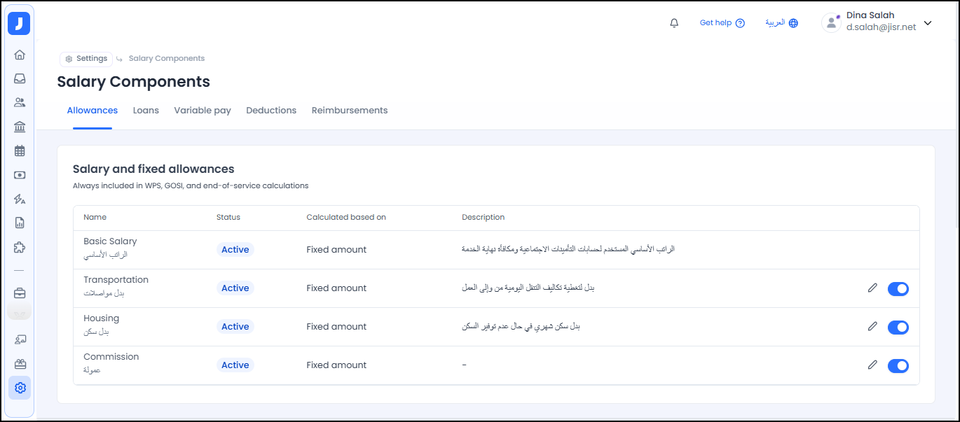 Or, the user can access the "Salary Components" tab to make any changes or additions to payroll items, such as allowances, Loans, Variable pay, deductions and Reimbursements.