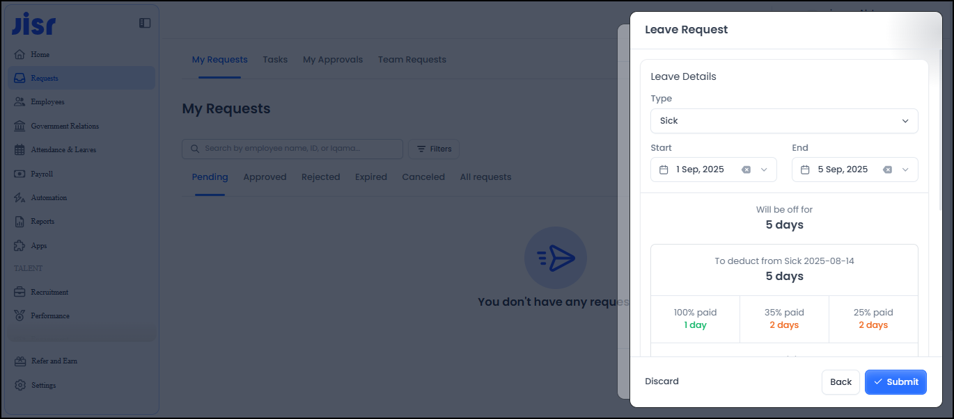 2. Select "Leaves" and "Sick Leave" as the request type.