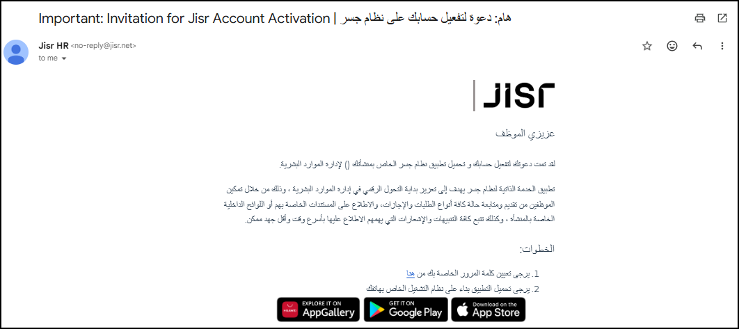 As a user (employee or team manager) in the "Jisr" system, your data will be pre-entered by your organization's Human Resources department or system administrator. The system administrator will typically send an email invitation to the email address registered in the system. The activation invitation will contain the following subject: