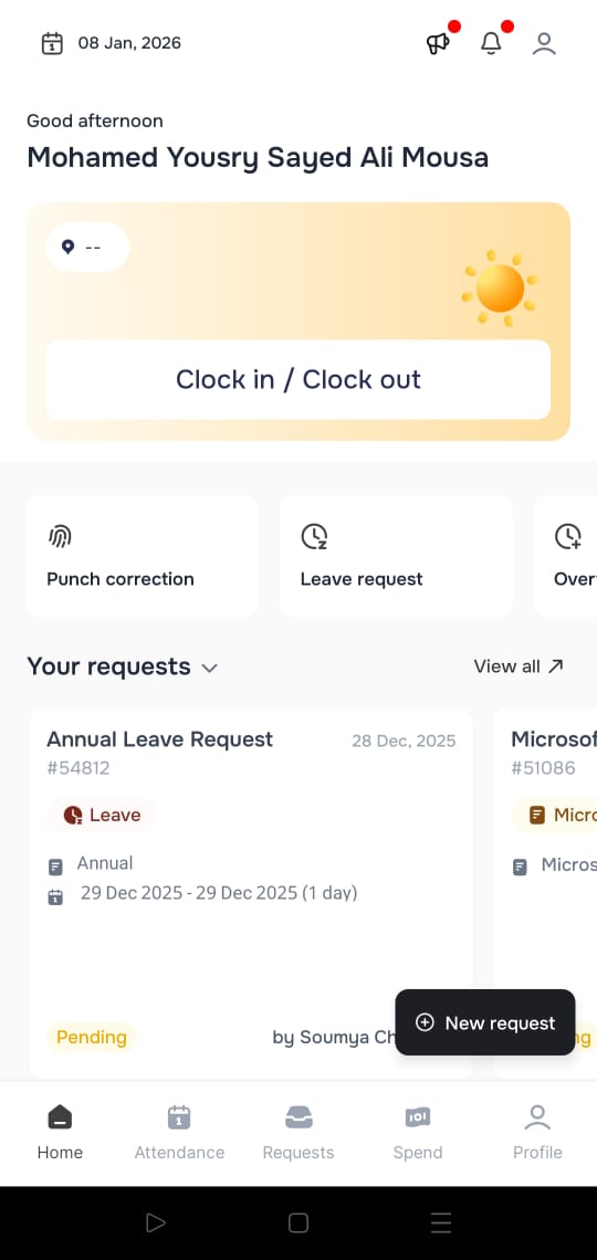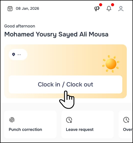 Today's date and fingerprint time will be displayed. Click on "Record a punch" or you can click the "Take the day off or call in sick" button, which will redirect you to a page to create a new request.