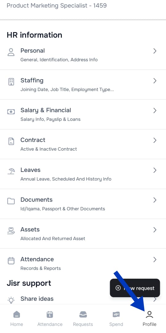 Users can manage their profile through the Jisr mobile app by clicking on the "Profile" tab, where they will be able to view the following information: