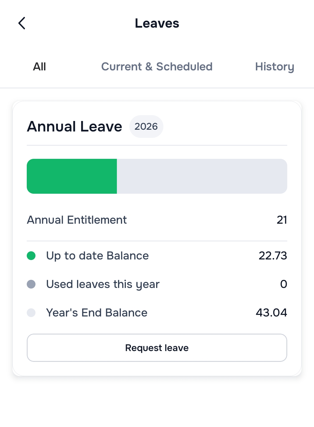 The user can view their annual leave, scheduled leave, and current vacation in detail under the "leaves" tab. They can also request a leave.