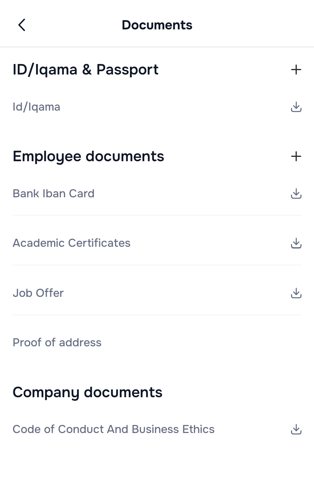 You can add employee-related documents such as ID and residency permits, and you can also upload the company's internal regulations or any company-related documents from the "Documents" tab.