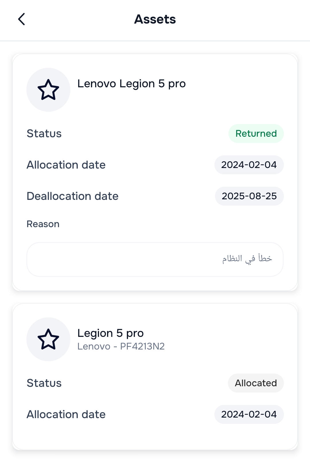 The user can view, from the "Assets" tab, the asset assigned to him/her, its status, and the date of allocation and deallocation (if applicable).