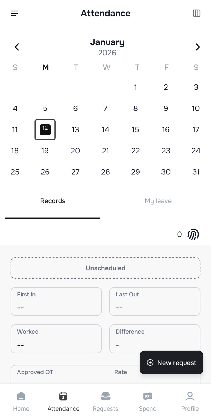 From the "Attendance" tab, you can view your attendance schedule for previous months and the current month, and check the record for each day, including fingerprints, scheduled work periods, and overtime hours, if any.