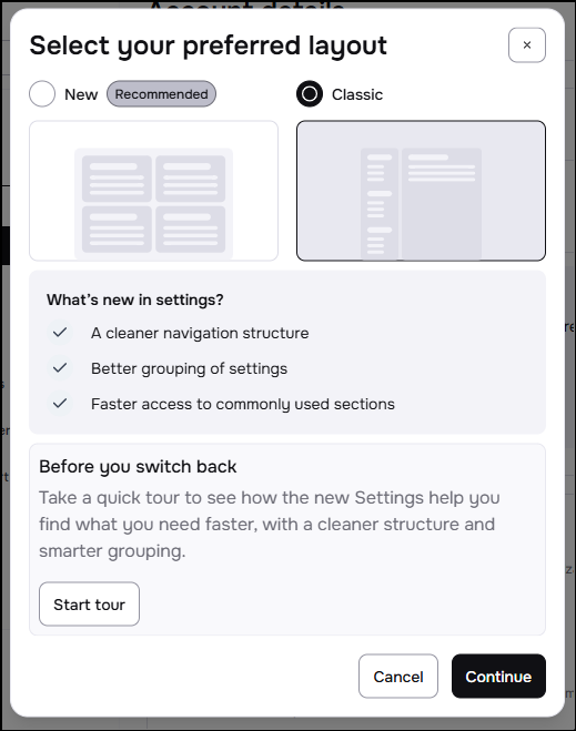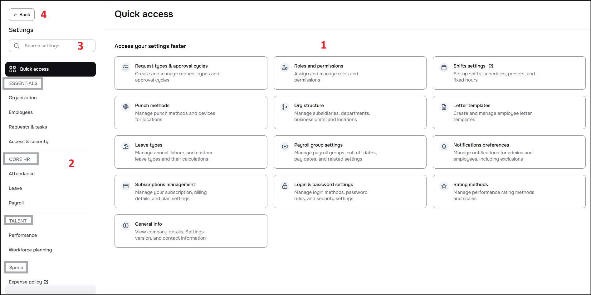 - A navigation bar for settings, categorized by product (Essentials, HR, Talent, Spend)
