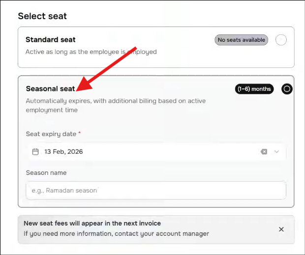 - On the next screen, you can choose the type of seat used for the account. Choose "seasonal seat"