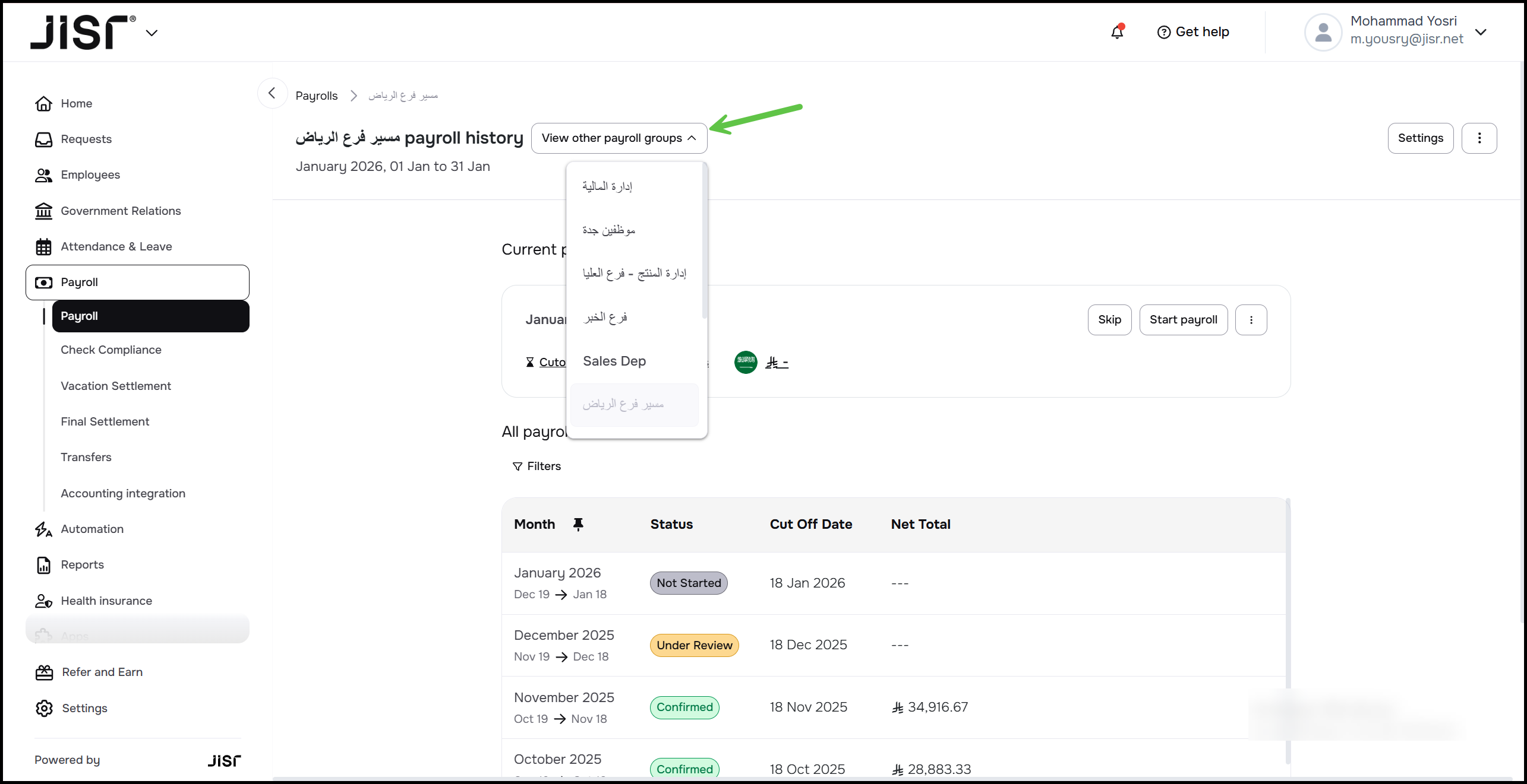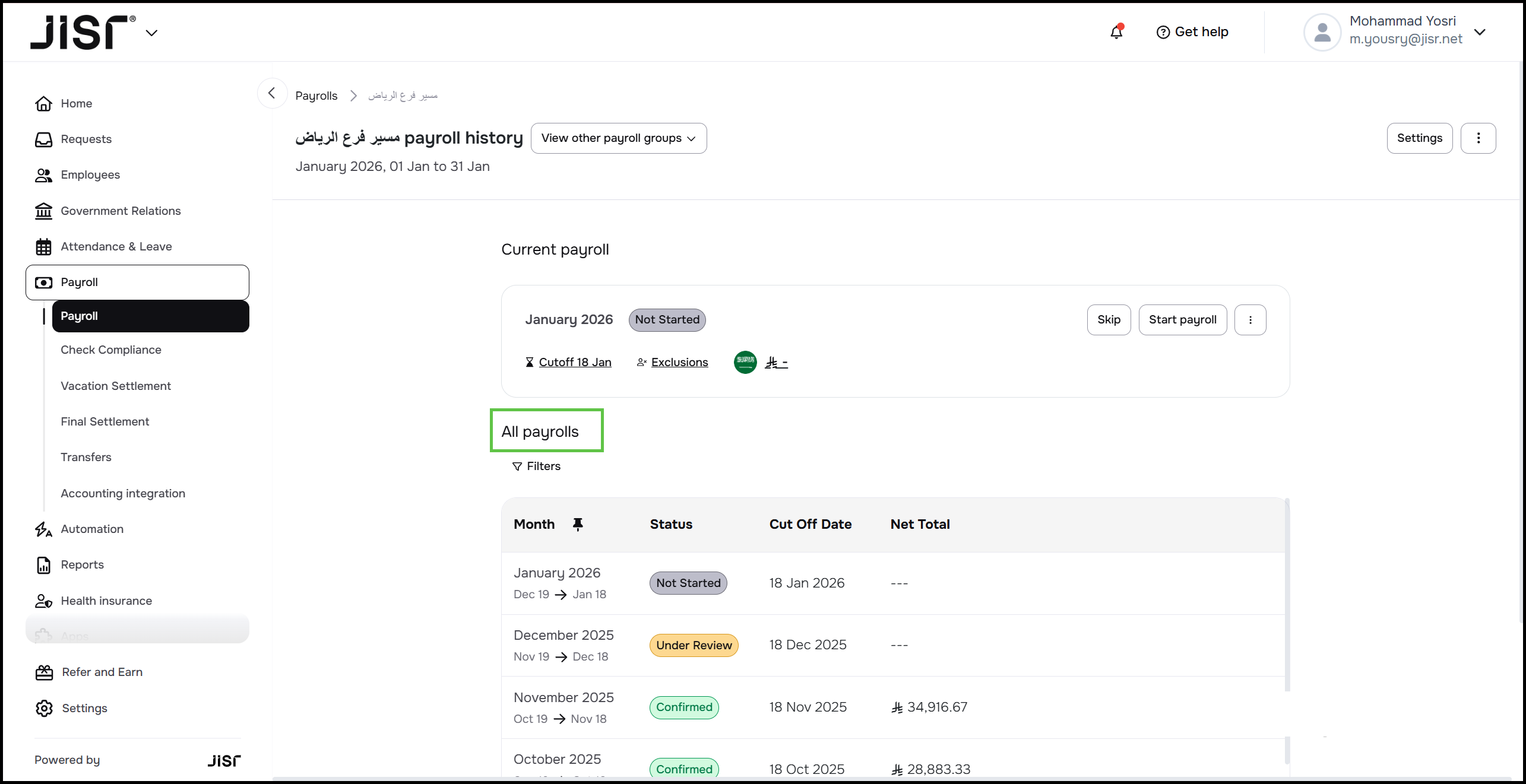4- All payroll statements for all time periods will be displayed, and details can be viewed (time period, special status of the process, date of process, and total net salaries of employees).
