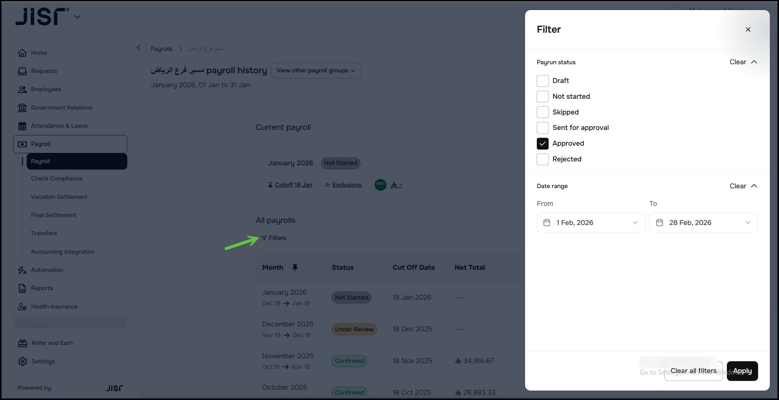 Note 1: You can filter and search for a specific time period for payroll based on specifying the payroll status or time period.