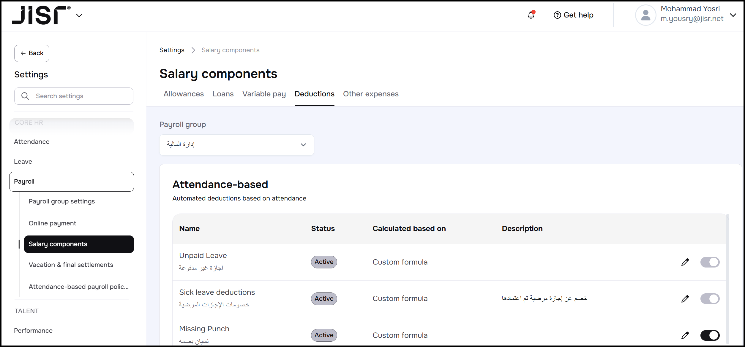 This article aims to clarify the concept of default payroll components in the accounting integration process, how to select these components and link them to their corresponding accounts in the accounting system, and how to define these components within the Jisr HR system.