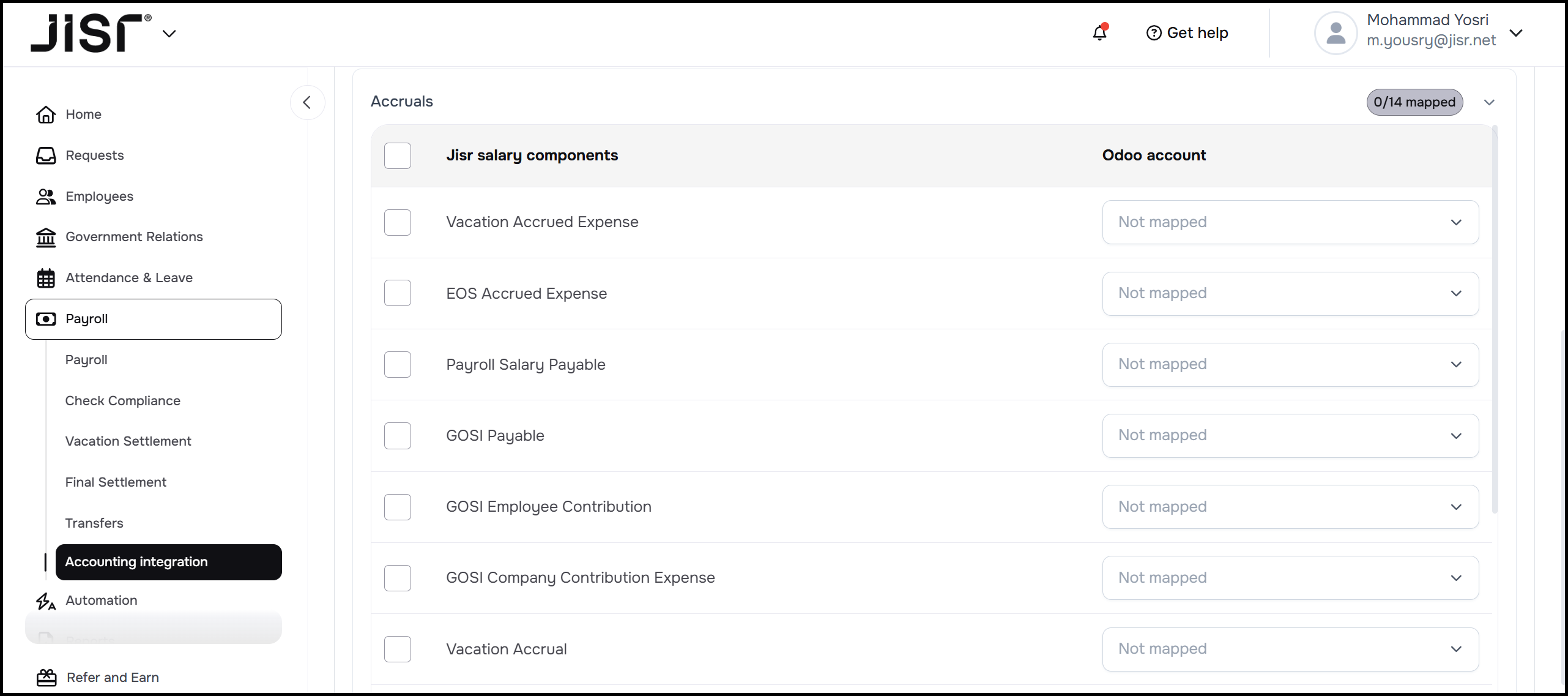 One of the most important steps in the accounting integration process is mapping the chart of accounts. Each payroll component in the Jisr system is integrating to one of the accounts defined in the user's accounting system, and accounting entries are created based on this integration.