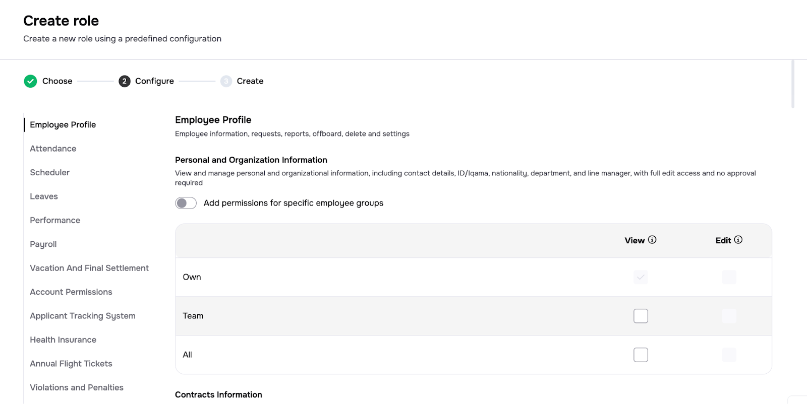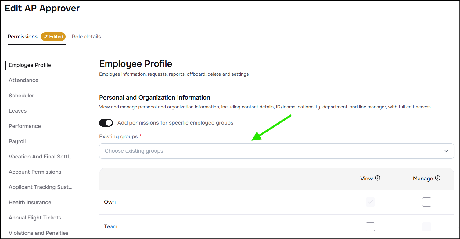 Previously, Jisr only supported limited access scopes for each permission (Own, Team, All). Now, admins can define the scope of any permission to include one or more of the employee groups that are pre-defined in the system. This way, you could for example grant an employee in the finance team access to payroll data of employees in the sales department, without having to grant him access to the data of all employees.
