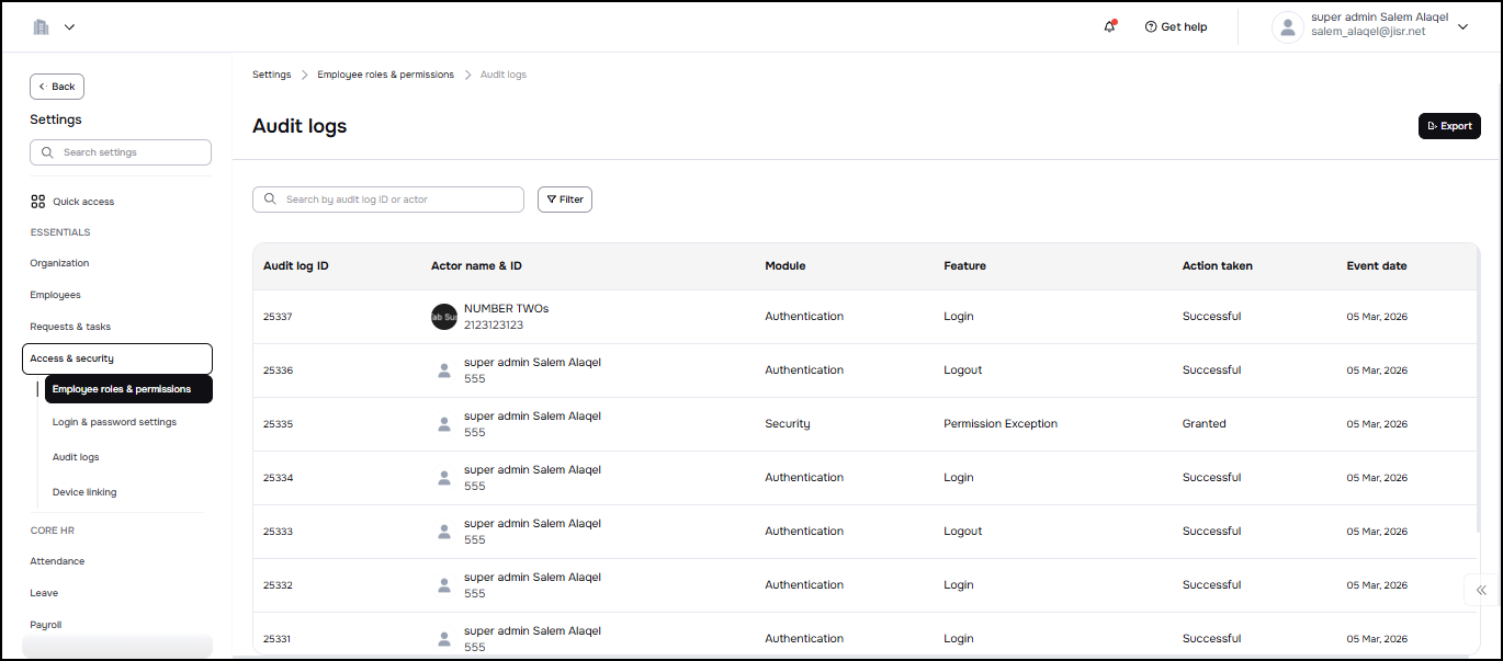 Note: The user can view the audit logs and see all the operations that took place in the permissions and security management system.