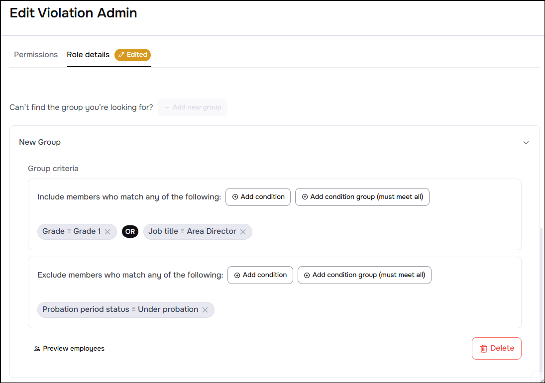 Instead of assigning roles to a specific list of employees by name, regardless of their professional attributes, you can assign roles to dynamic groups of employees based on specific criteria, such as location, department, title.. and much more. Imagine you want to grant data access to all employees in the Riyadh branch only. With dynamic groups, you can easily define this in the roles settings, and the role will be automatically applied to any employee who joins the Riyadh branch afterwards.